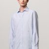 Regular-fit shirt with a pointed collar, classic soft front placket, and a cotton voilè inner bib. Made of striped watercolor cotton. Features custom badge embroidery for initials and a pointed rear yoke. Made in Italy.