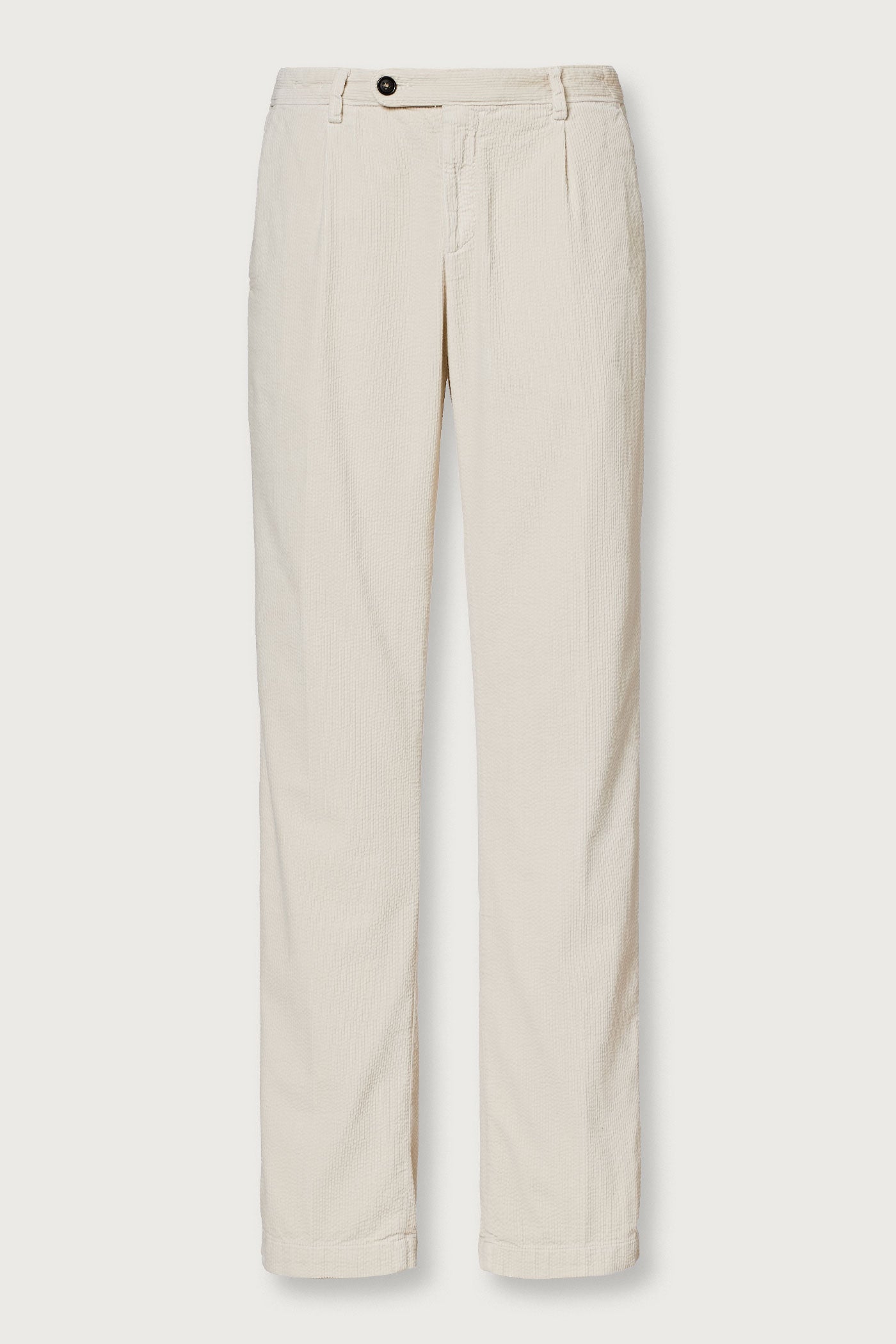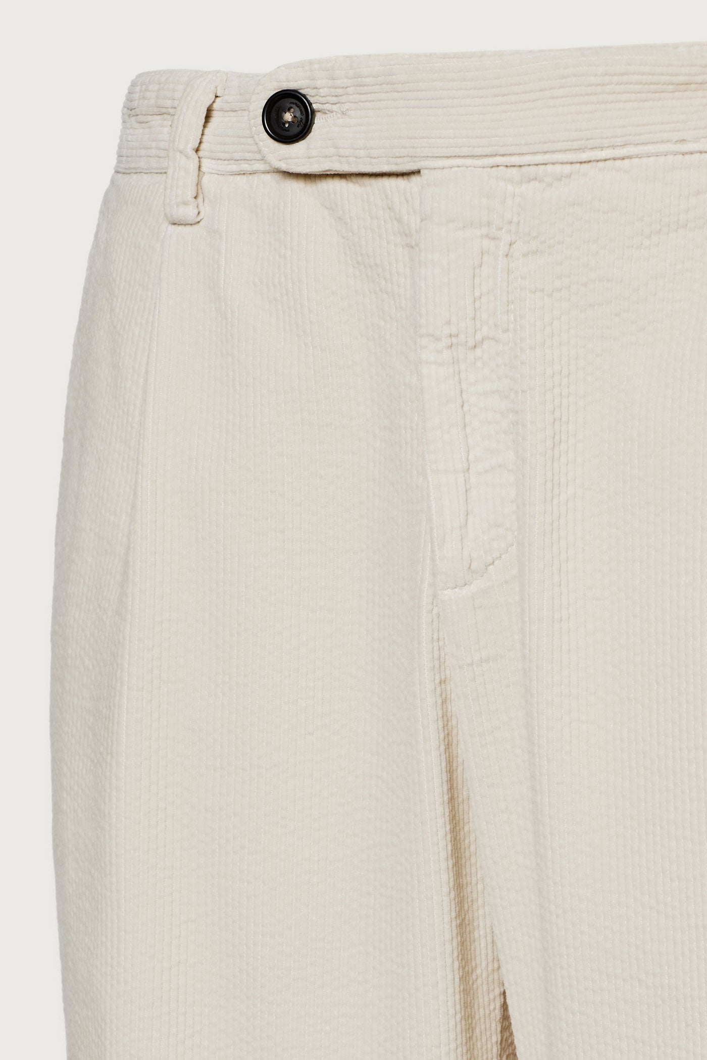 Loose fit trousers in cotton corduroy featuring stitched darts, slant pockets, a tab fastening on the front, dark horn buttons, a concealed zip, flap pockets on the back and belt loops on the waistband. Made in Italy.