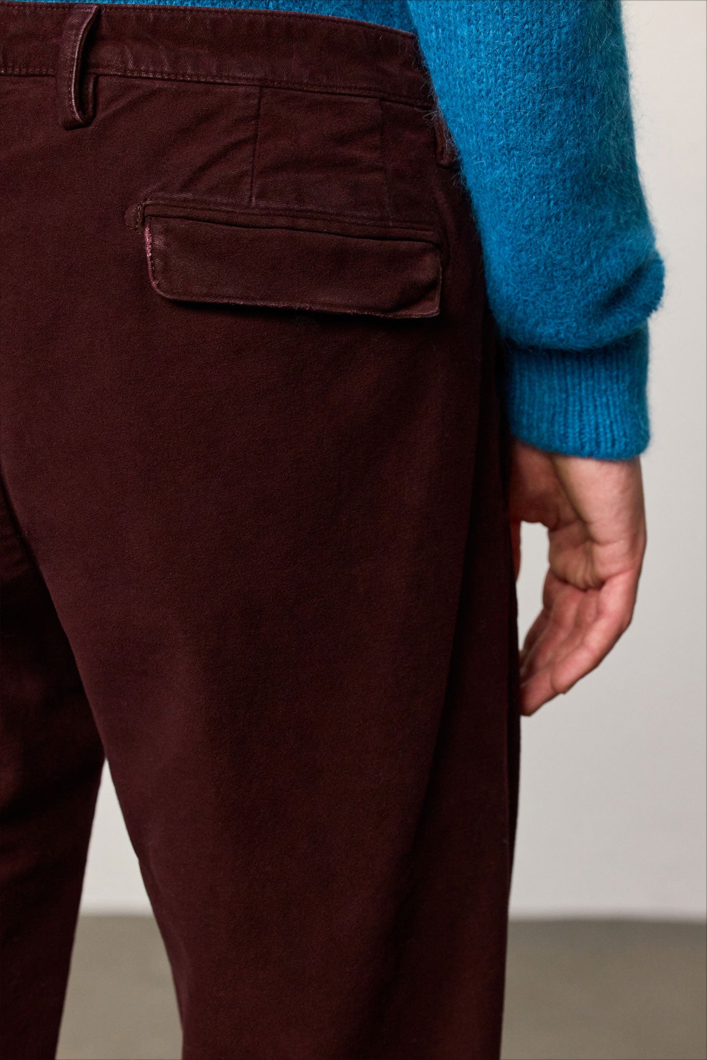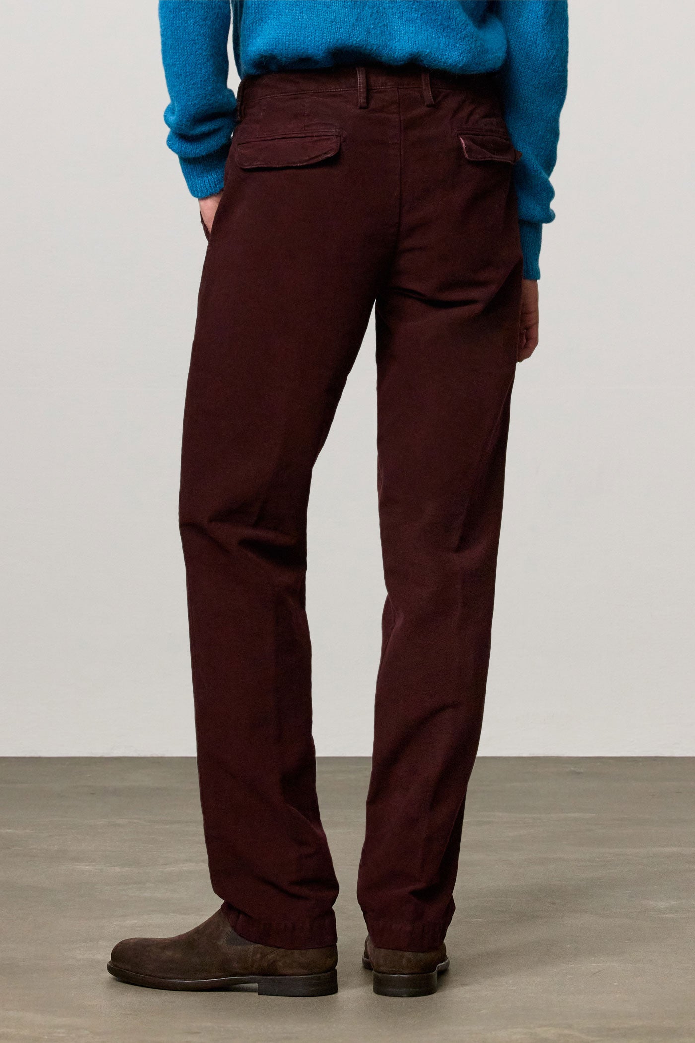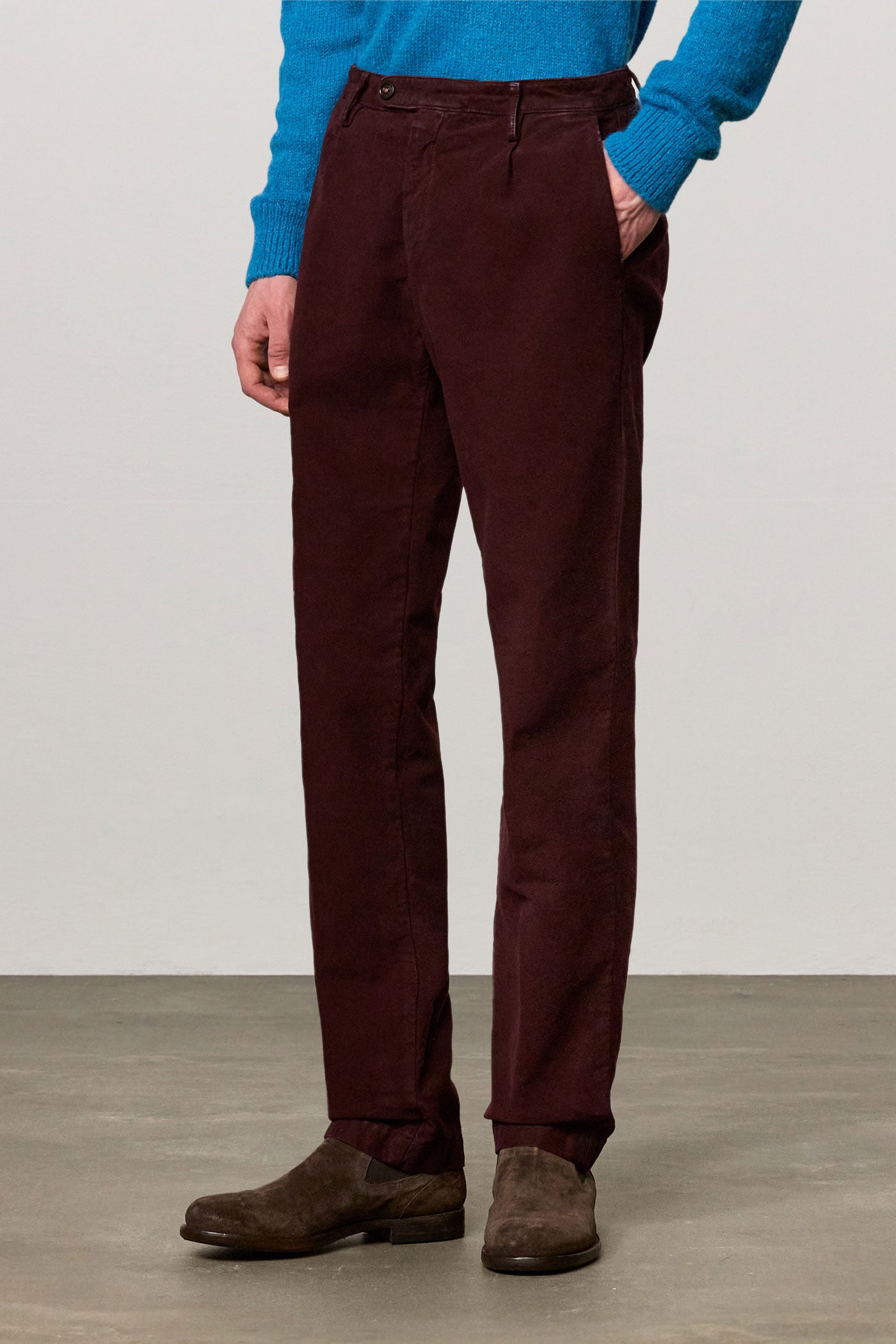 Wide-leg trousers in cotton moleskin with stitched pleats, slanted side pockets, front tab closure with dark horn buttons, concealed zip, flap pockets at the back and belt loops at the waist. Made in Italy.