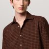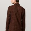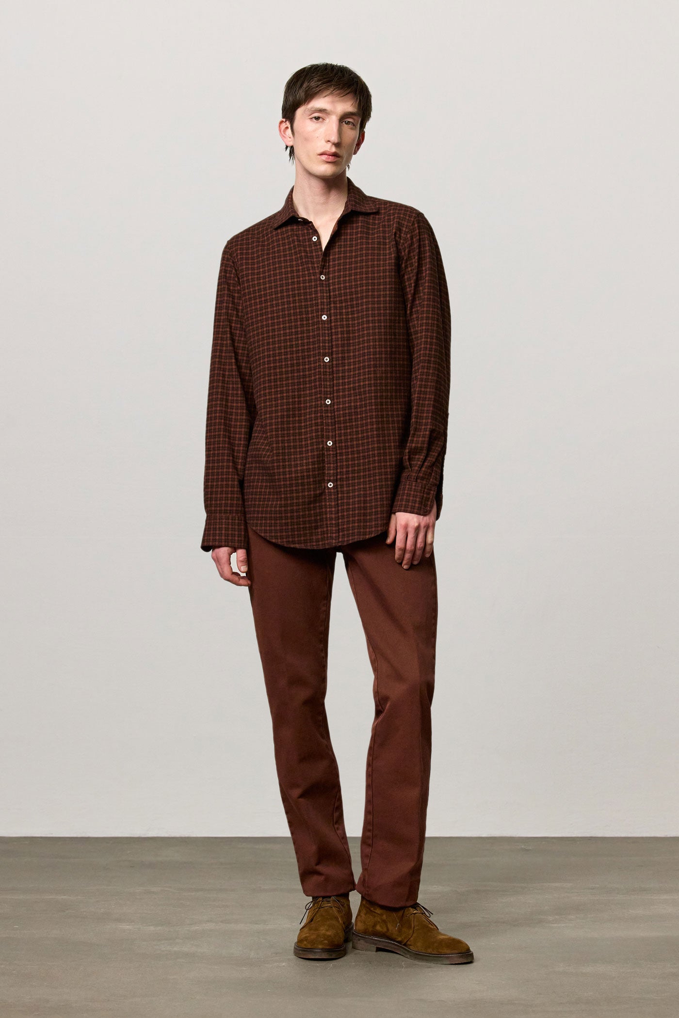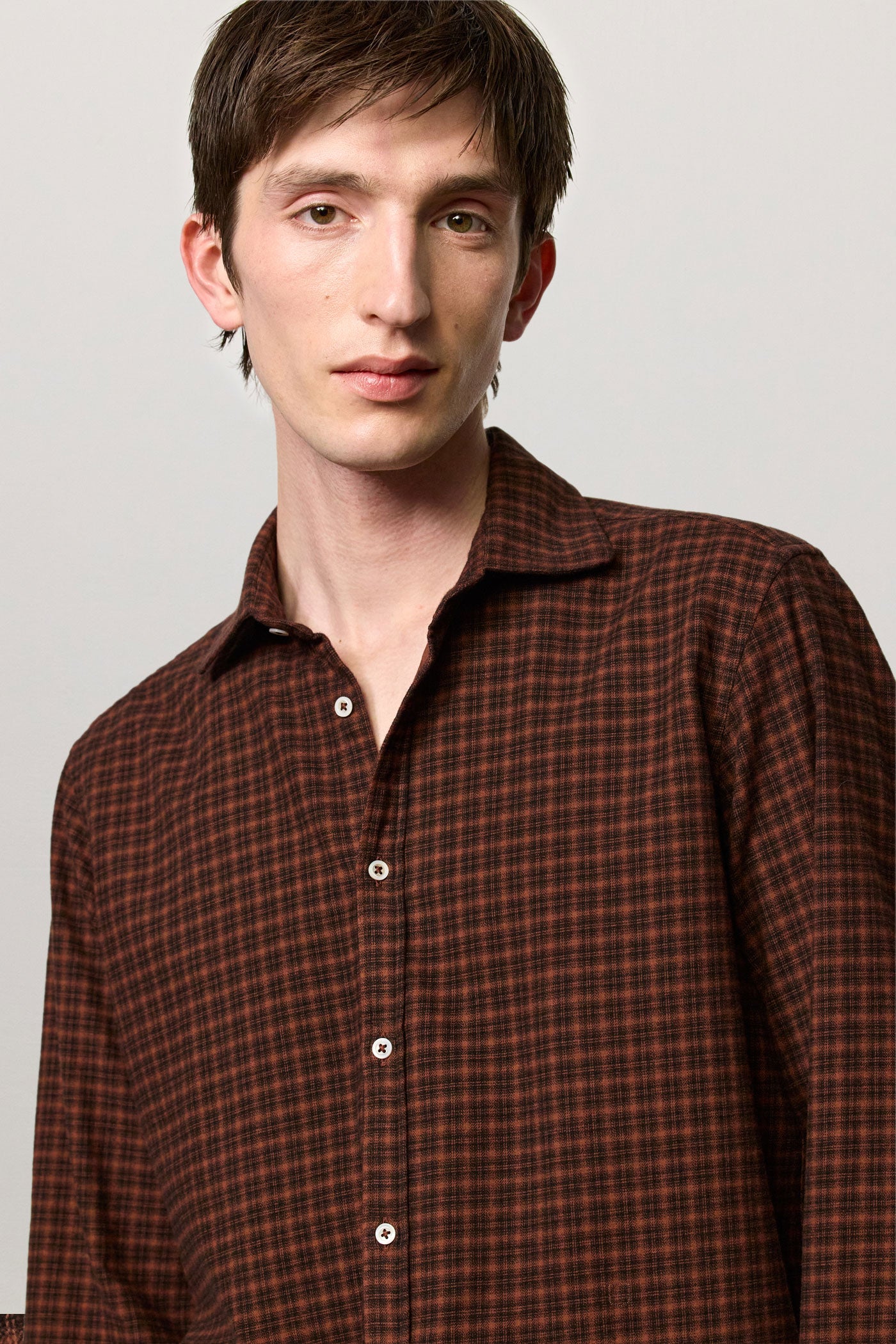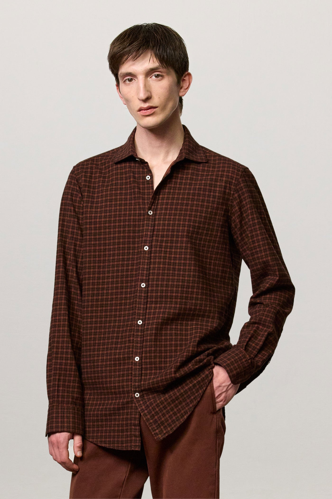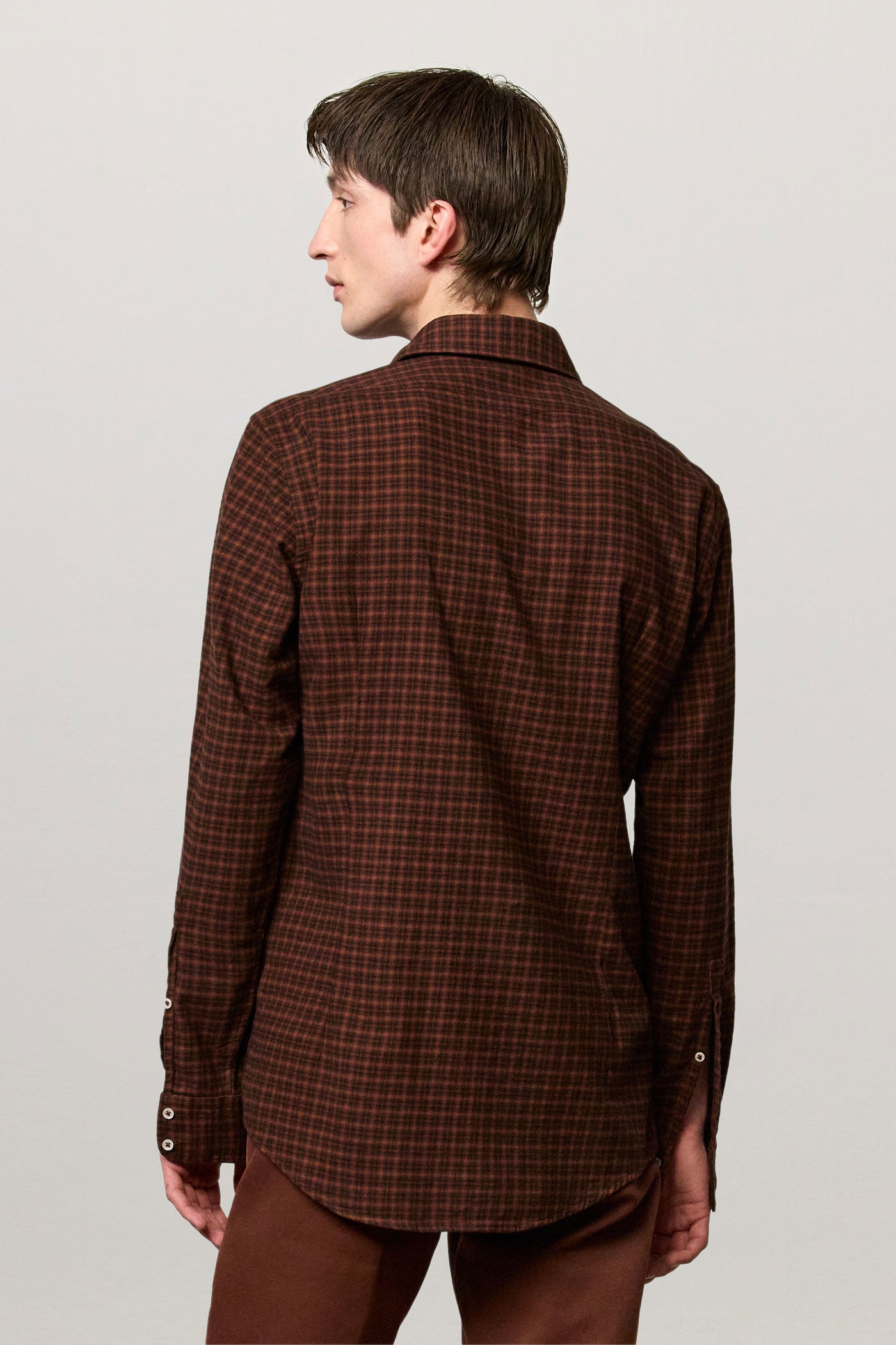 Shirt with a soft rounded collar, front closure, internal cotton voile plastron detail and embroidered crest for numbering. Pointed back yoke and rounded hem. Classic fit. Crafted from cotton micro check with a watercolor effect. Made in Italy.