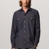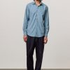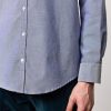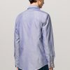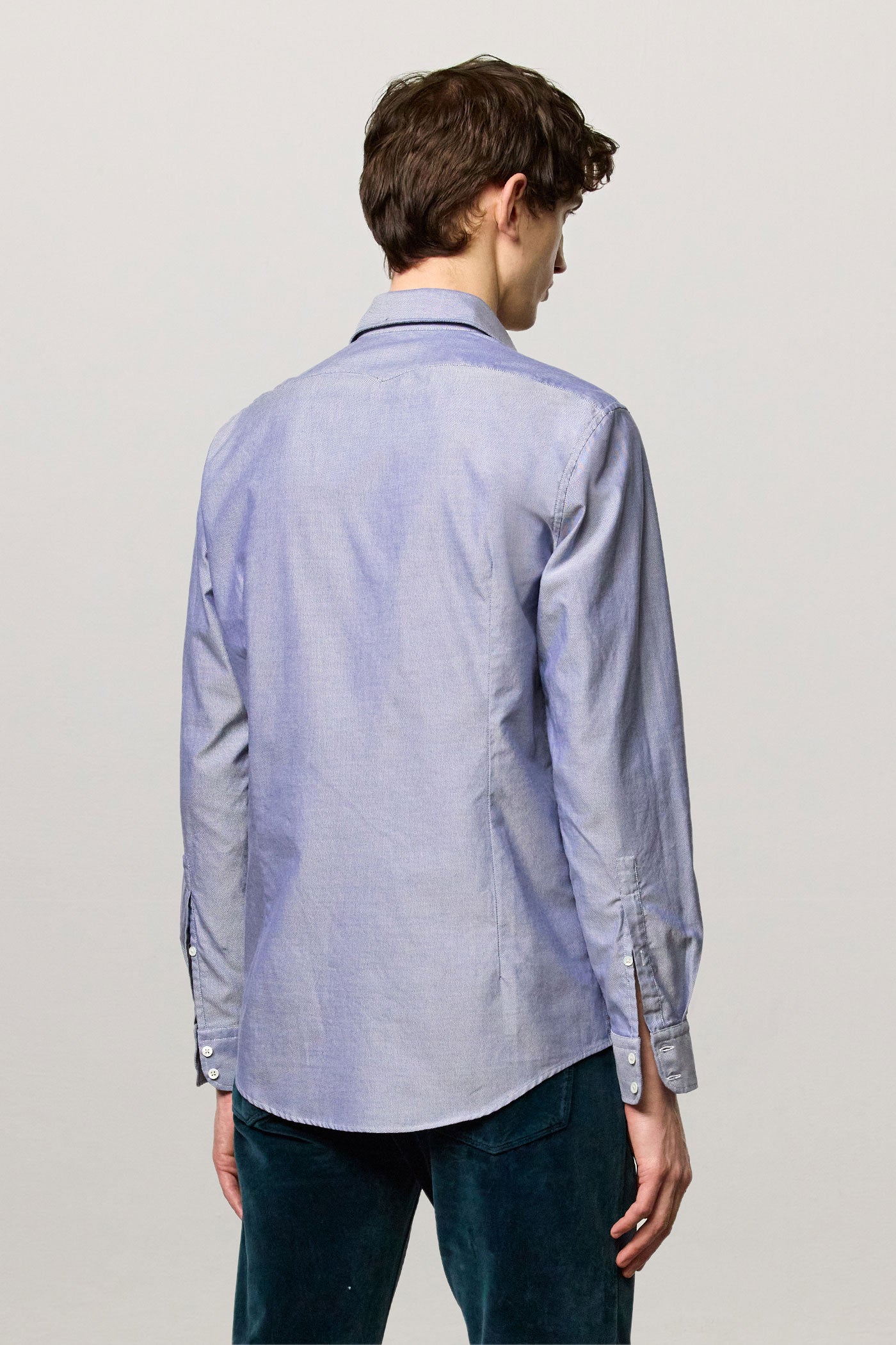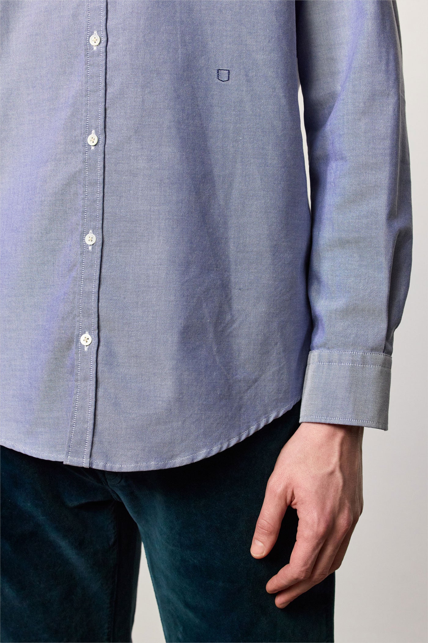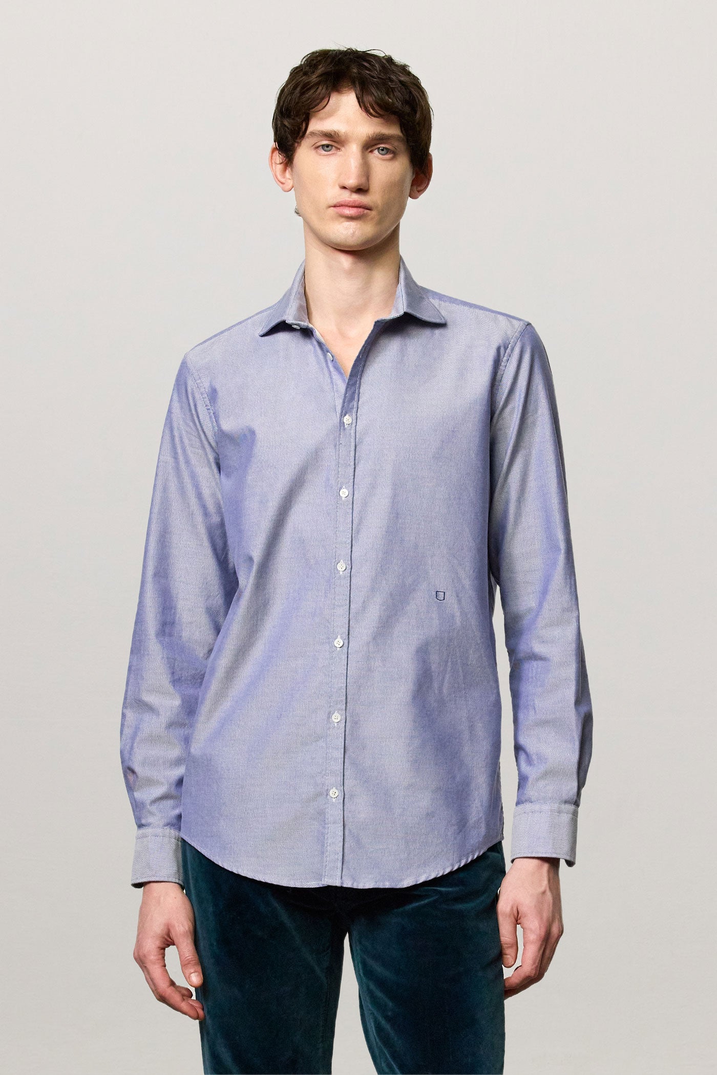 Shirt with a soft rounded collar, front closure, internal cotton voile plastron detail and embroidered crest for numbering. Pointed back yoke and rounded hem. Classic fit. Crafted from pure cotton bi-colour Oxford. Made in Italy.