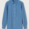 Regular-fit shirt with a pointed collar, classic soft front placket, and a cotton voilè inner bib. Made of watercolor oxford cotton. Features custom badge embroidery for initials and a pointed rear yoke. Made in Italy.