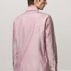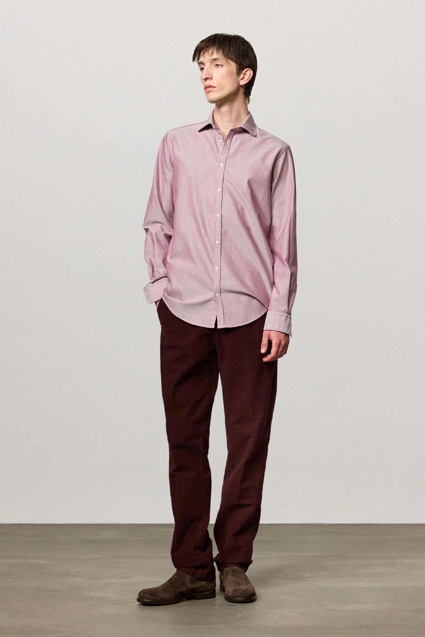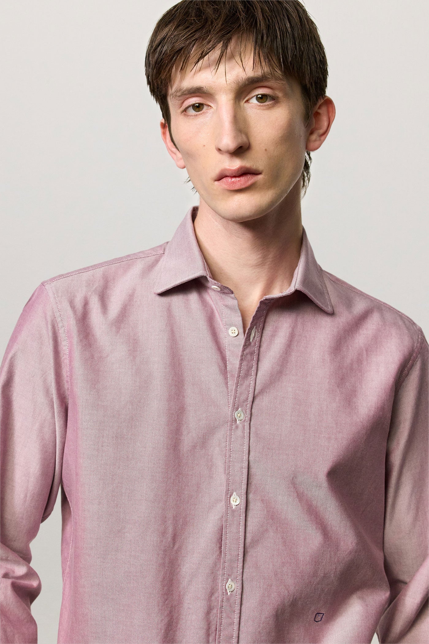 Shirt with a soft rounded collar, front closure, internal cotton voile plastron detail and embroidered crest for numbering. Pointed back yoke and rounded hem. Classic fit. Crafted from pure cotton bi-colour Oxford. Made in Italy.