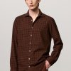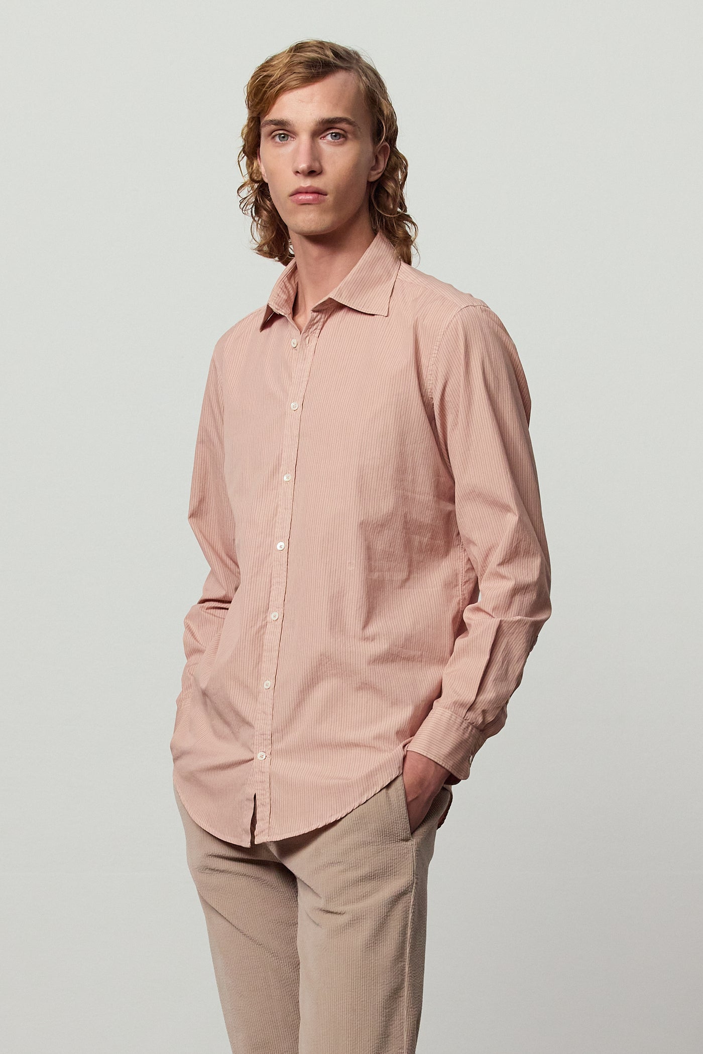 Regular-fit shirt with a pointed collar, classic soft front placket, and a cotton voilè inner bib. Made of striped watercolor cotton. Features custom badge embroidery for initials and a pointed rear yoke. Made in Italy.