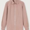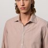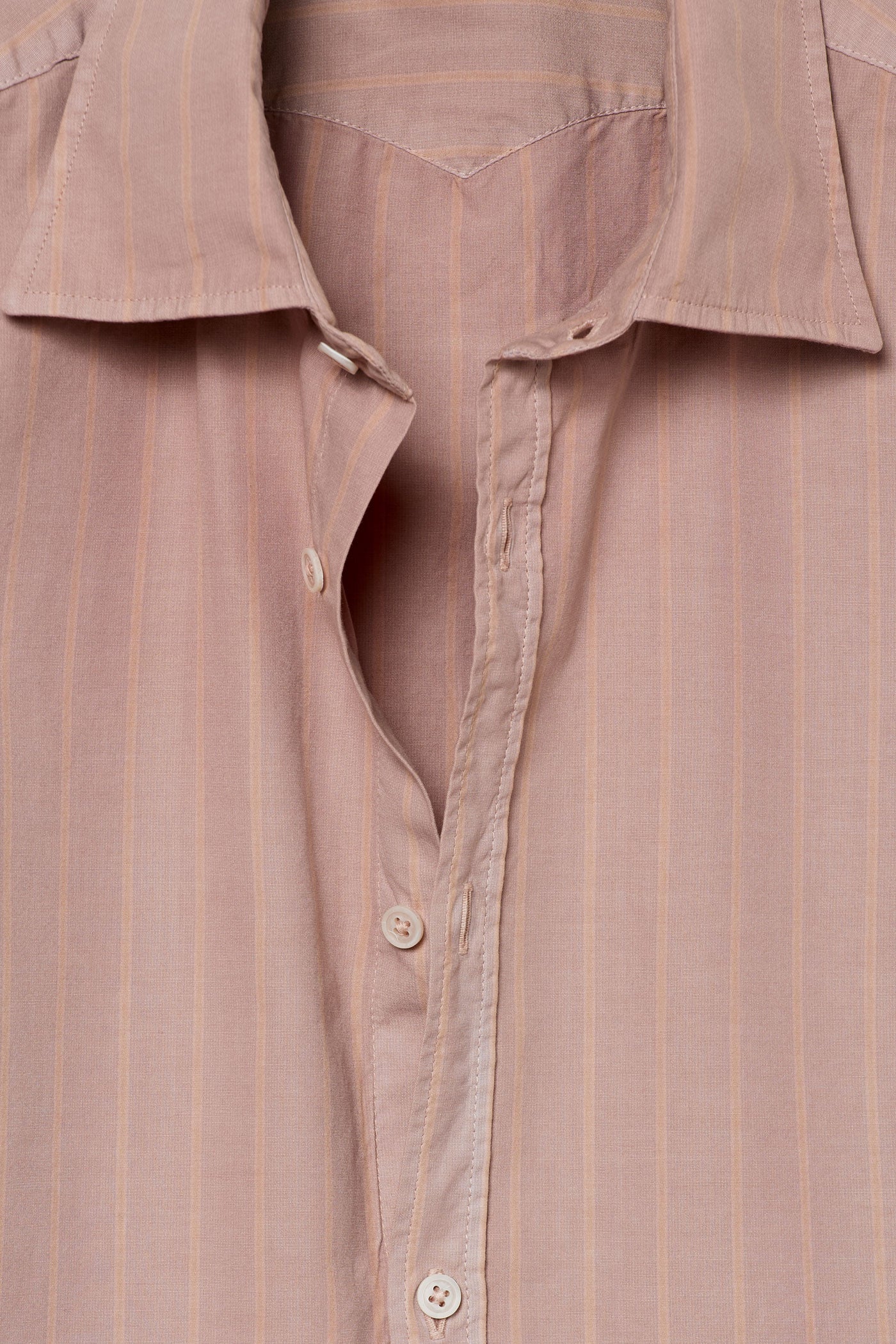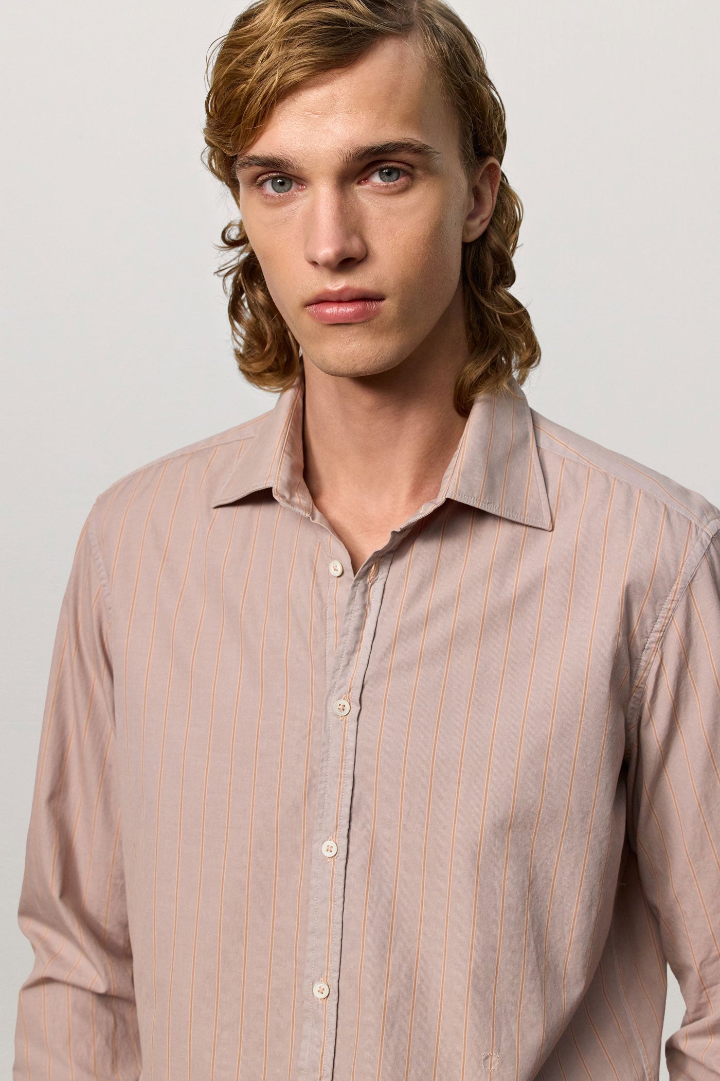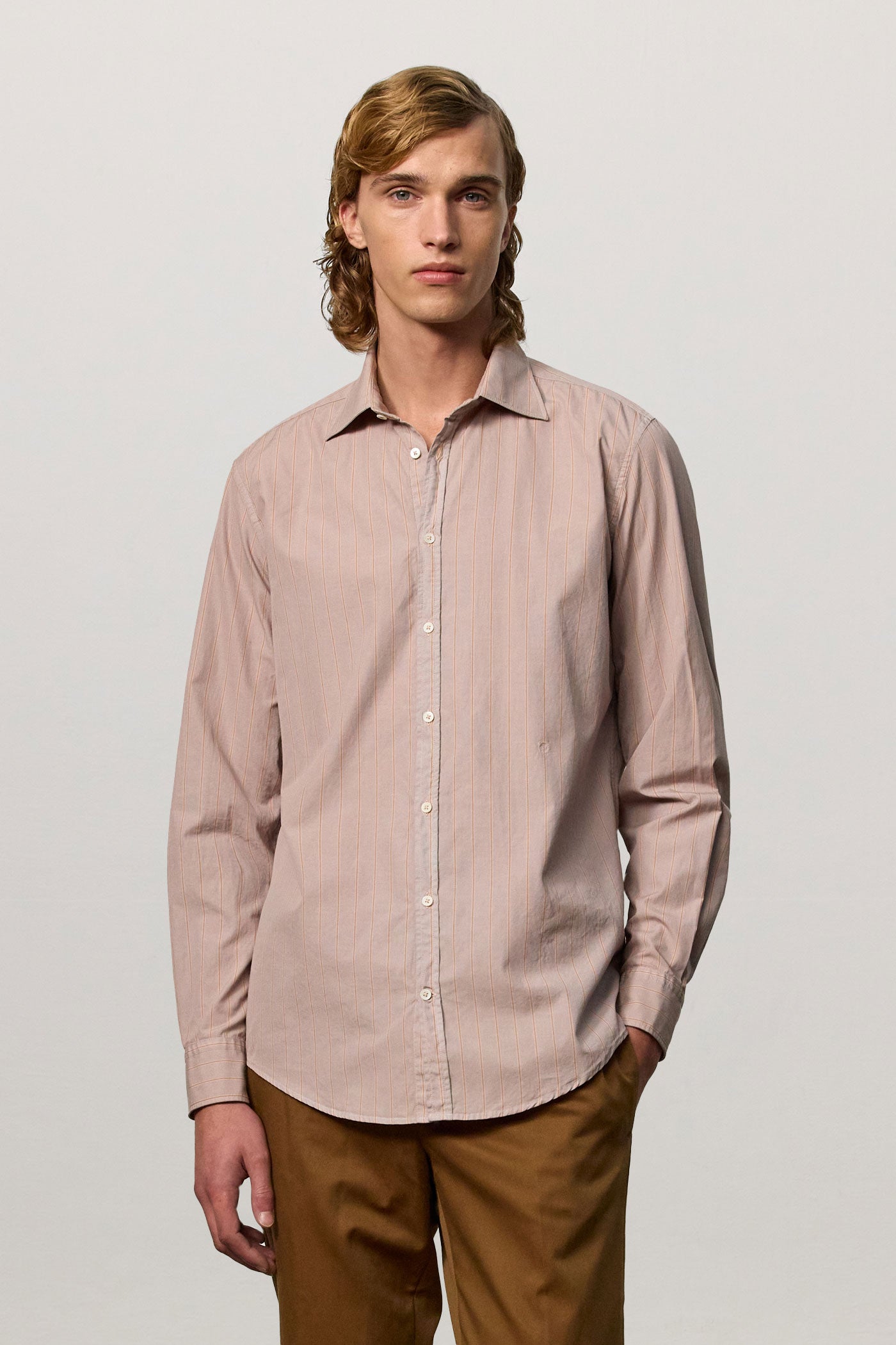 Regular-fit shirt with a pointed collar, classic soft front placket, and a cotton voilè inner bib. Made of striped watercolor cotton. Features custom badge embroidery for initials and a pointed rear yoke. Made in Italy.