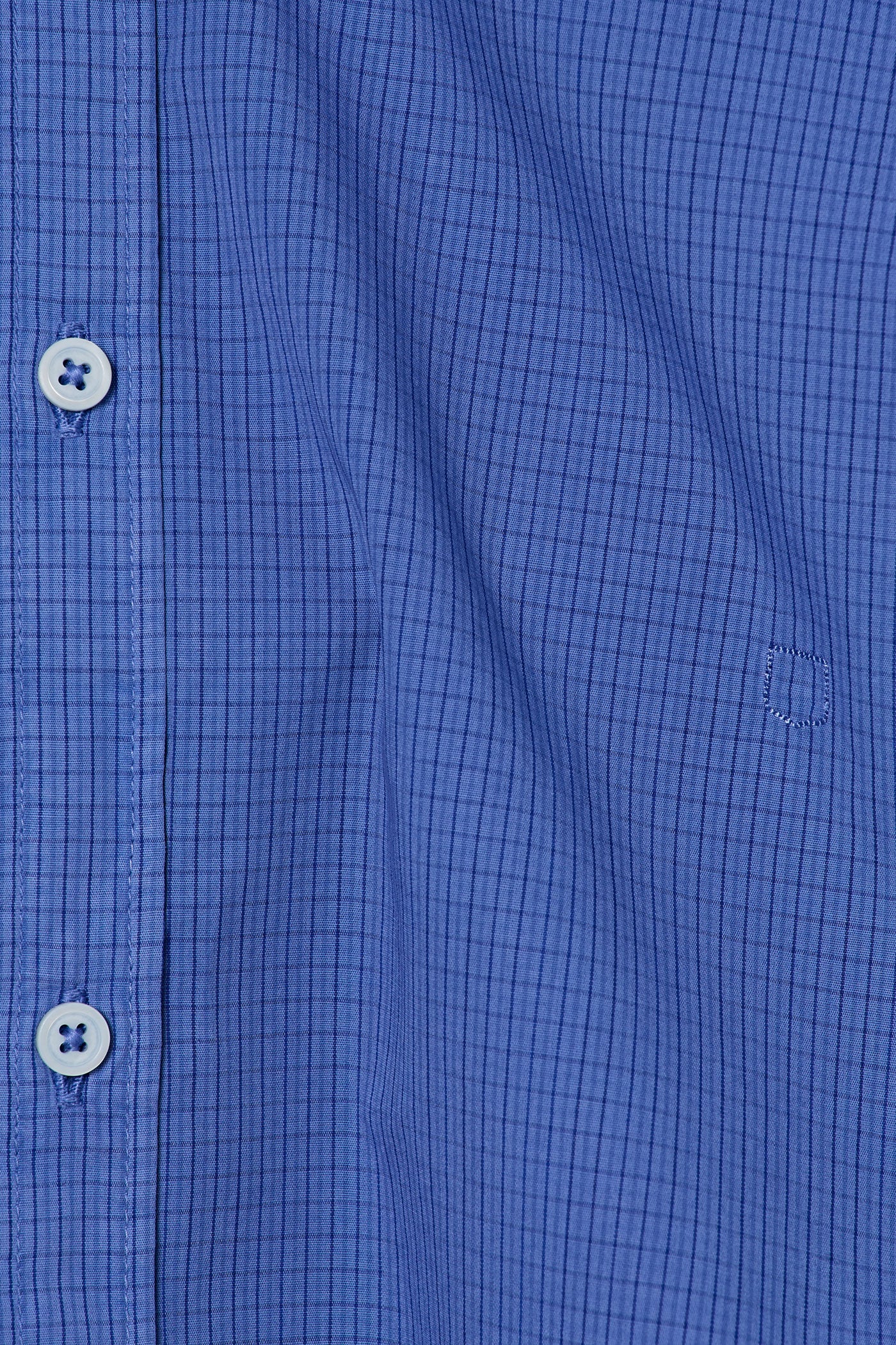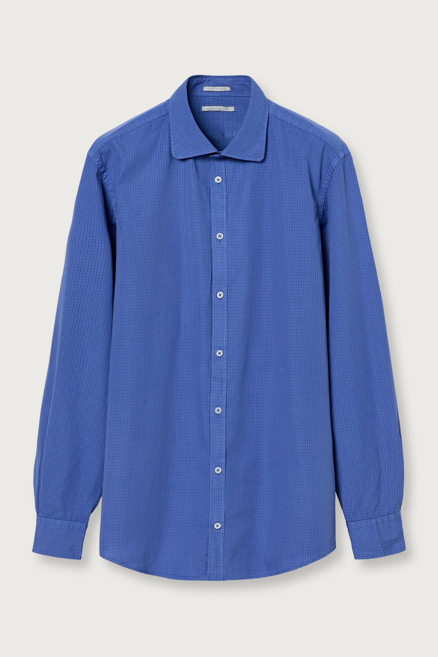 Soft collar shirt with rounded tips, front closure, detail of the inner bib in cotton voile, and shield embroidery for placing numbers, pointed back yoke, rounded bottom, classic fit. Made from micro check watercolor cotton. Made in Italy.