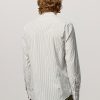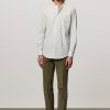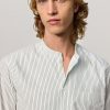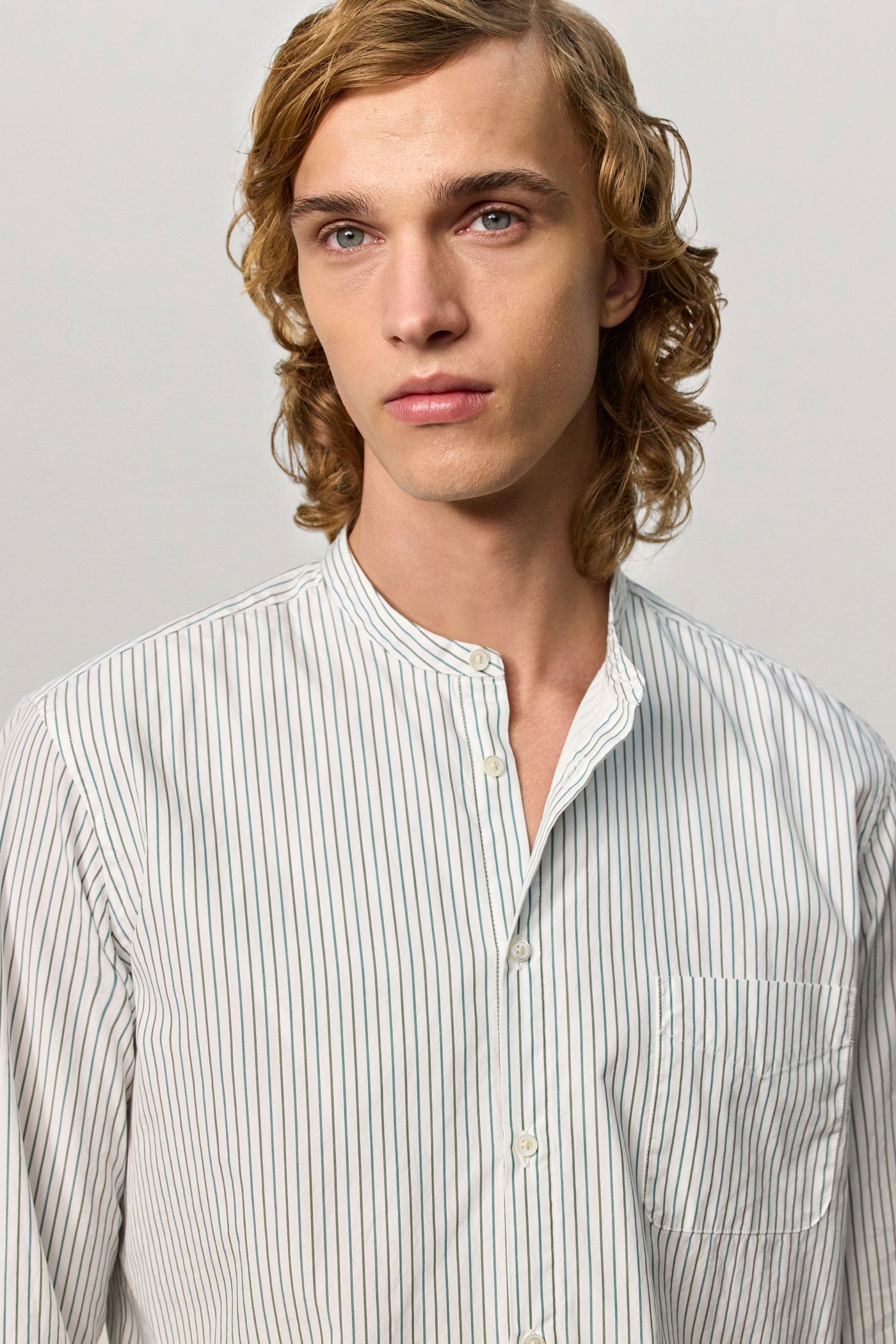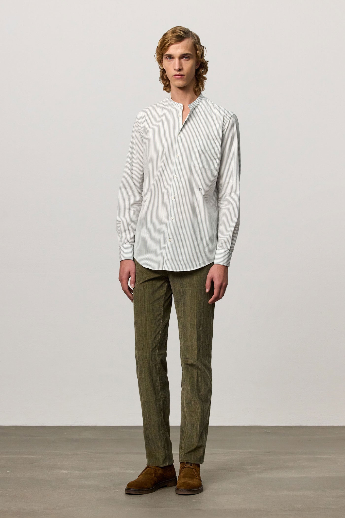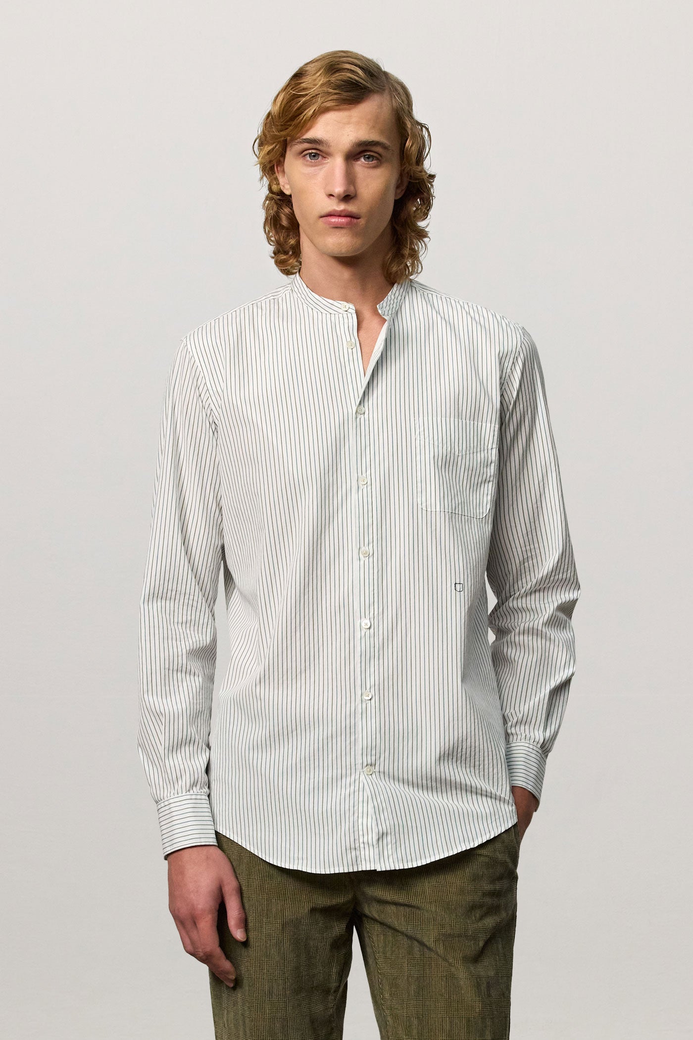 Regular-fit shirt with a grandad collar, classic soft front placket, and a cotton voile inner bib. Custom badge embroidery for initials and a pointed rear yoke. Made in Italy.