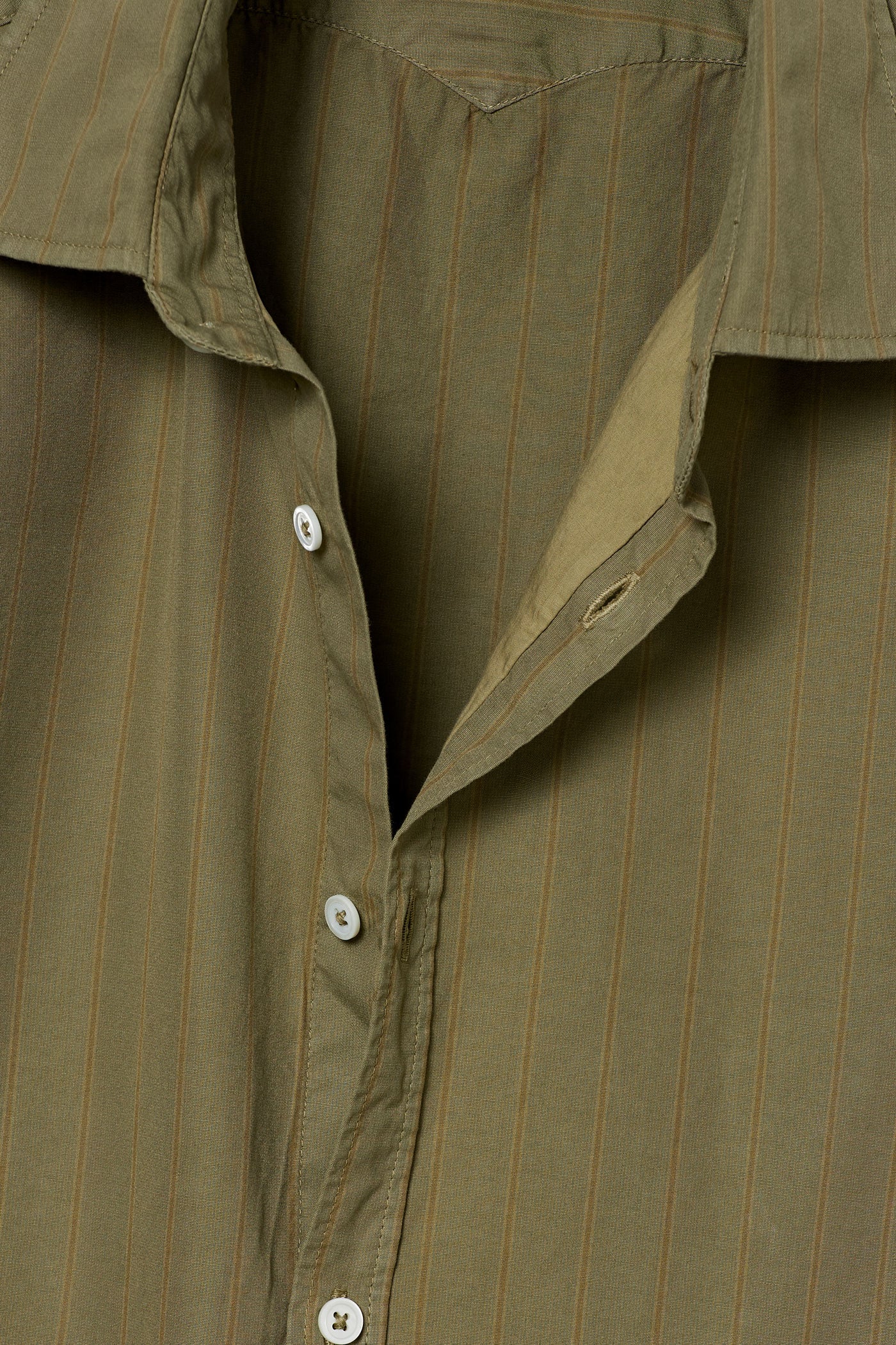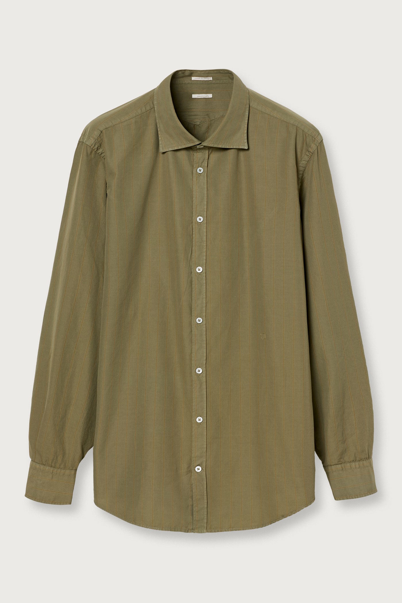 Regular-fit shirt with a pointed collar, classic soft front placket, and a cotton voilè inner bib. Made of striped watercolor cotton. Features custom badge embroidery for initials and a pointed rear yoke. Made in Italy.