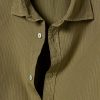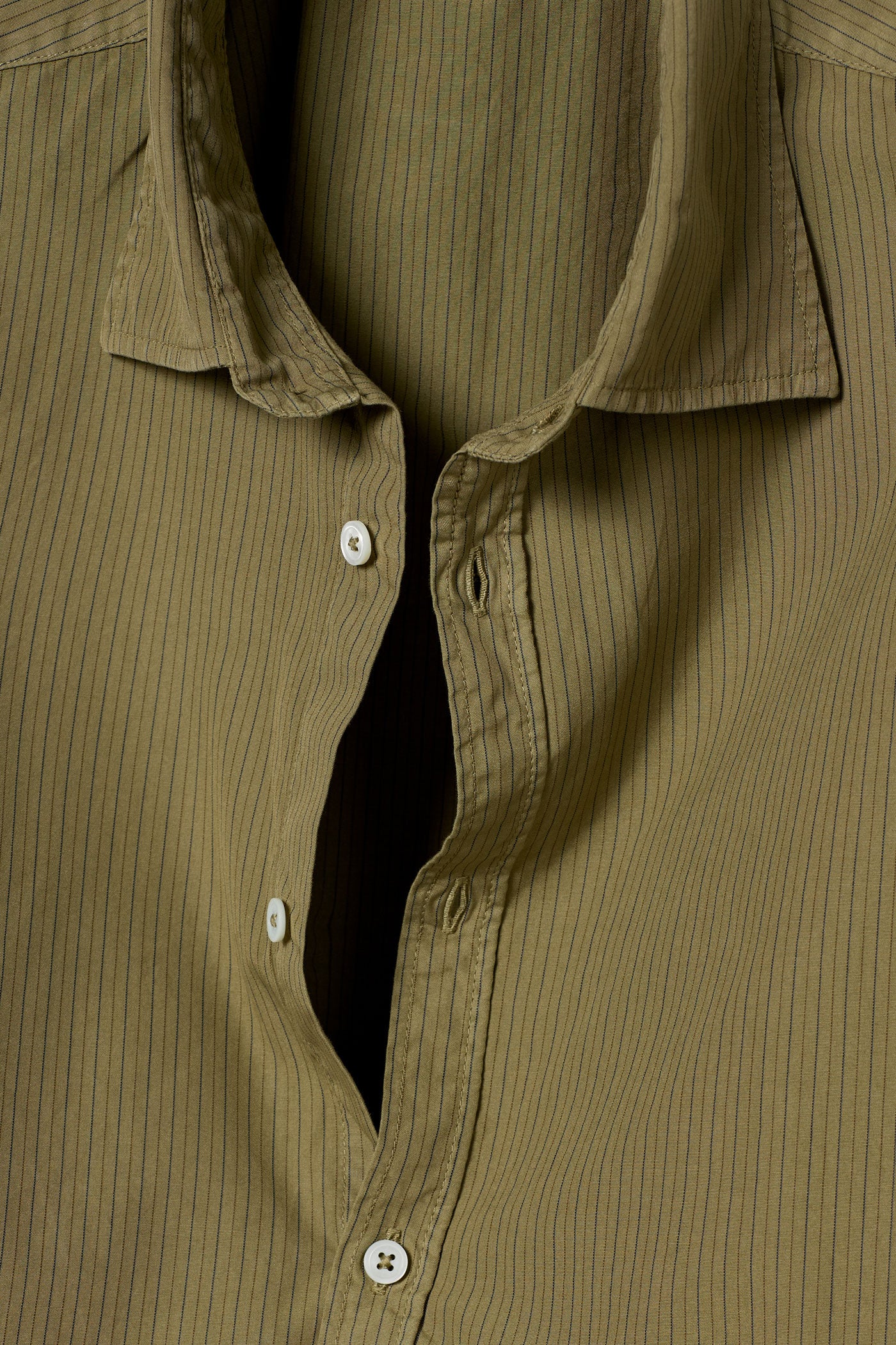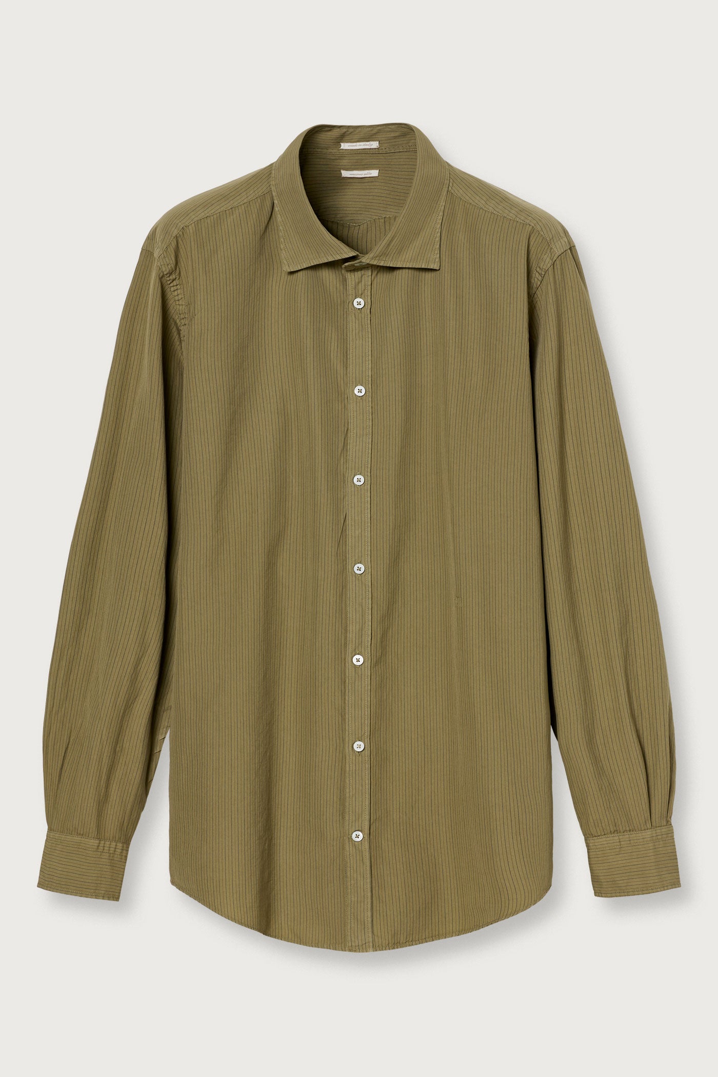 Regular-fit shirt with a pointed collar, classic soft front placket, and a cotton voilè inner bib. Made of striped watercolor cotton. Features custom badge embroidery for initials and a pointed rear yoke. Made in Italy.