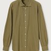 Regular-fit shirt with a pointed collar, classic soft front placket, and a cotton voilè inner bib. Made of striped watercolor cotton. Features custom badge embroidery for initials and a pointed rear yoke. Made in Italy.