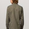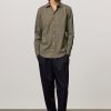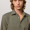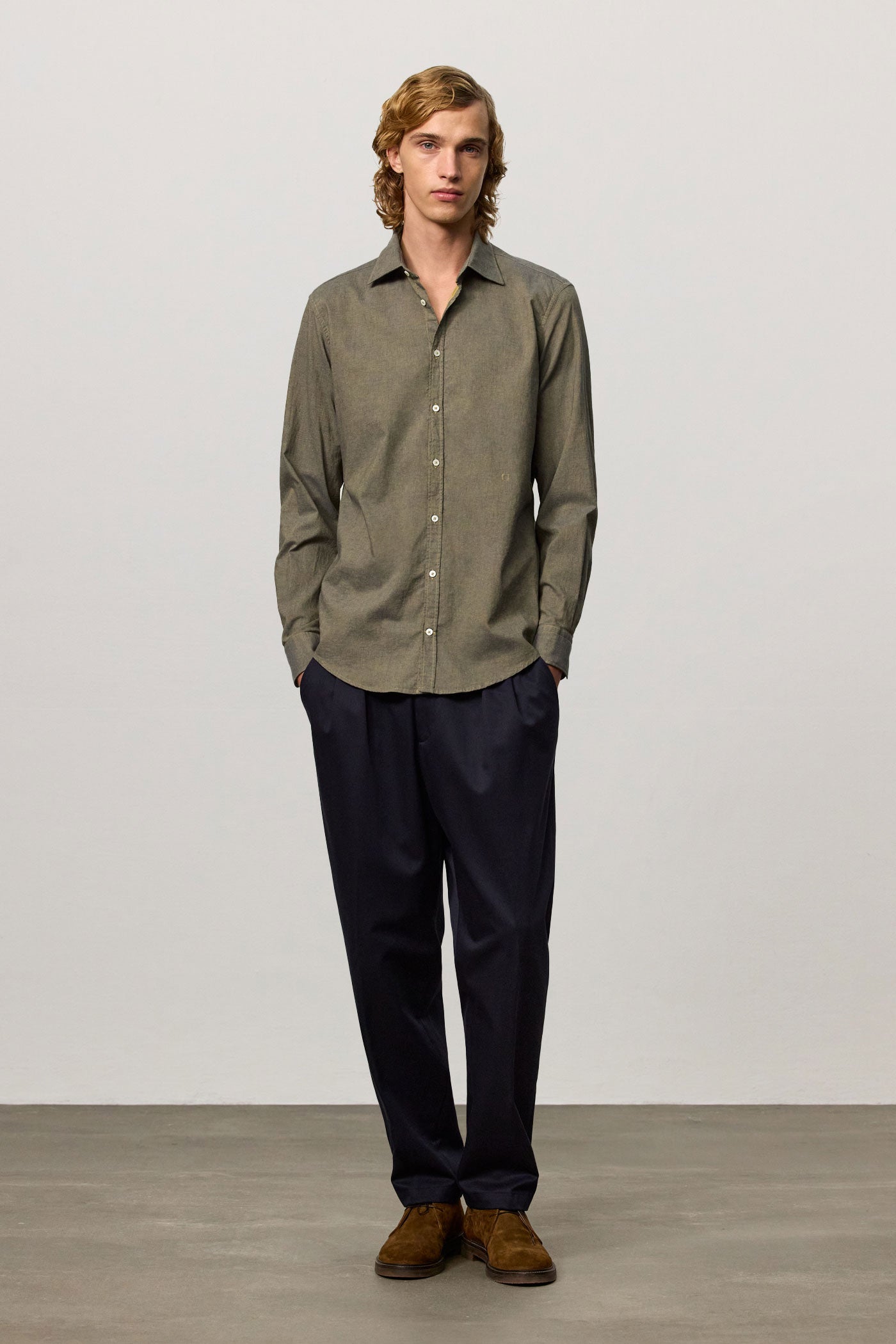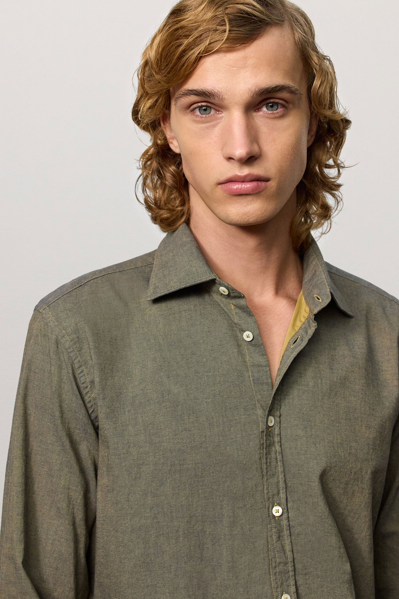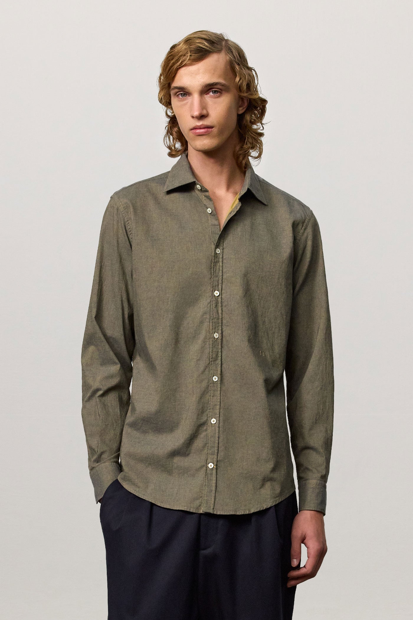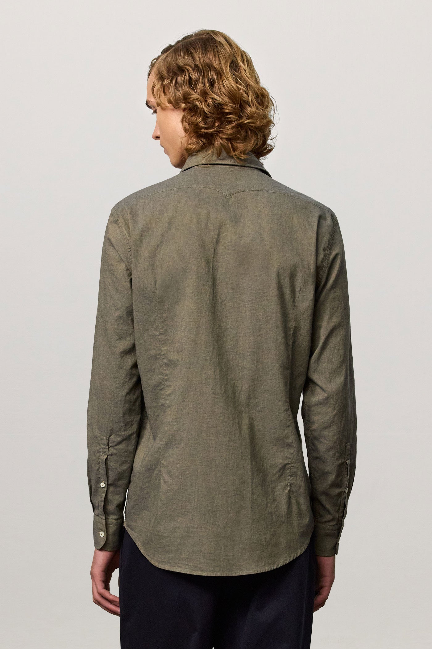 Regular-fit shirt with a pointed collar, classic soft front placket, and a cotton voilè inner bib. Made of watercolor cotton chambray. Features custom badge embroidery for initials and a pointed rear yoke. Made in Italy.