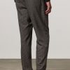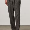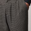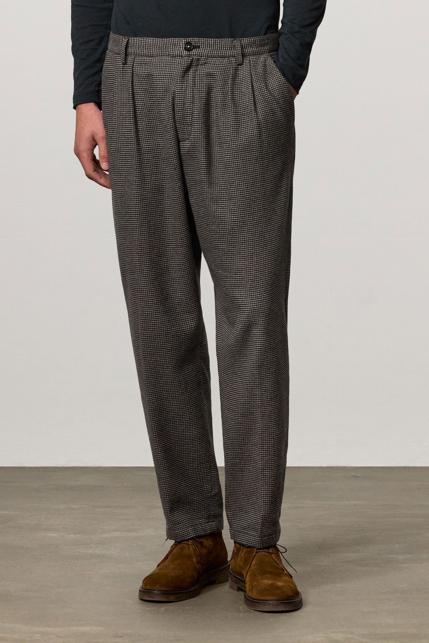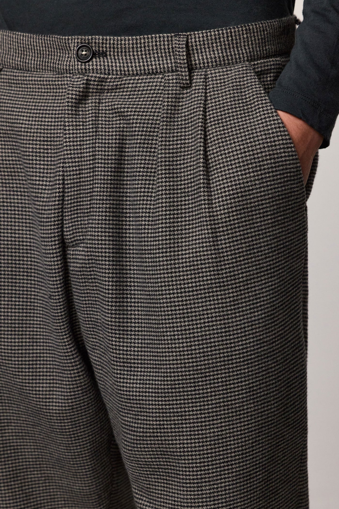 Loose-fit double-pleat trousers in peach-touch cotton micro houndstooth, featuring a front button and zip closure, slanted side pockets, and rear welt pockets. 20.3 cm leg opening. Made in Italy.