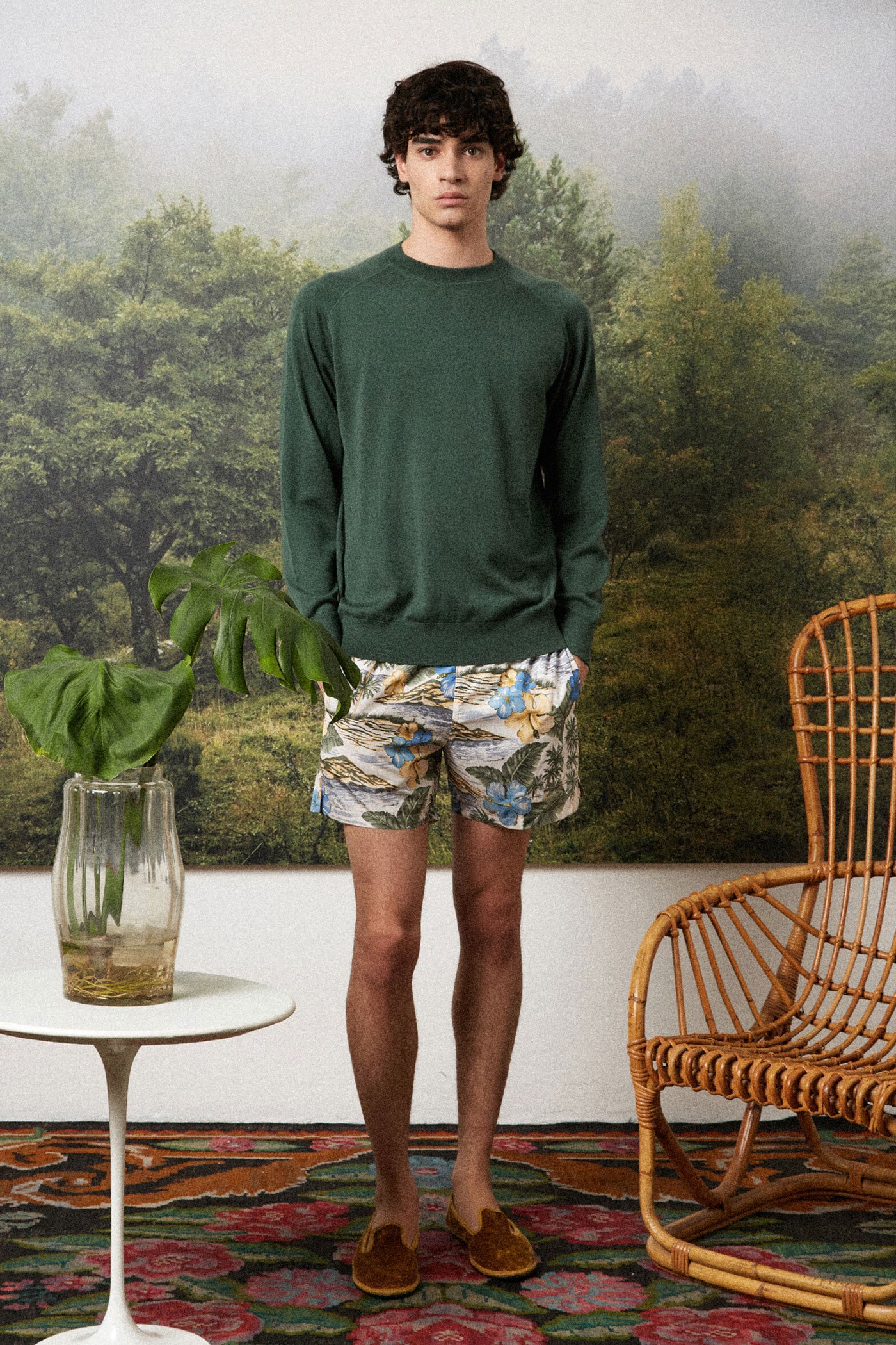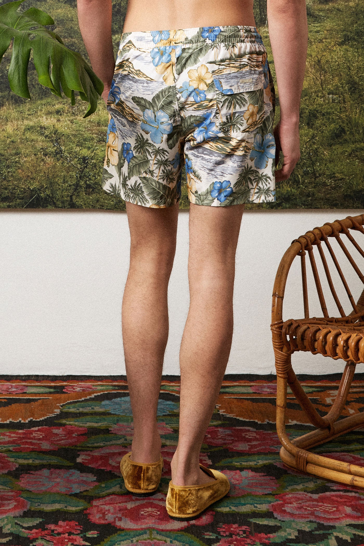 Classic fit swim shorts with drawstrings waistband, pockets and mesh slip lining. Made in two different tropical prints. Made in Italy.