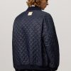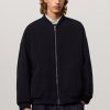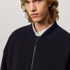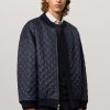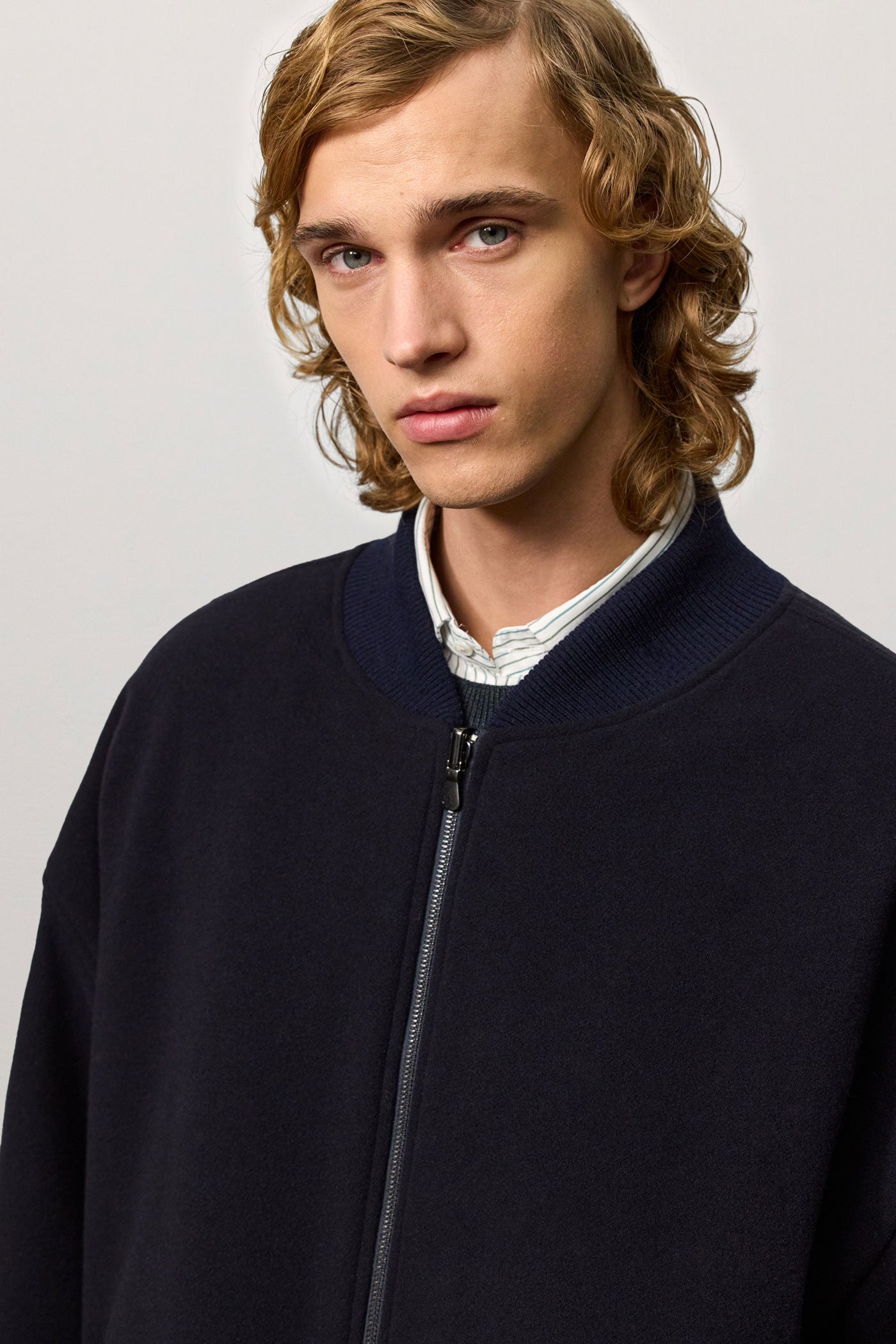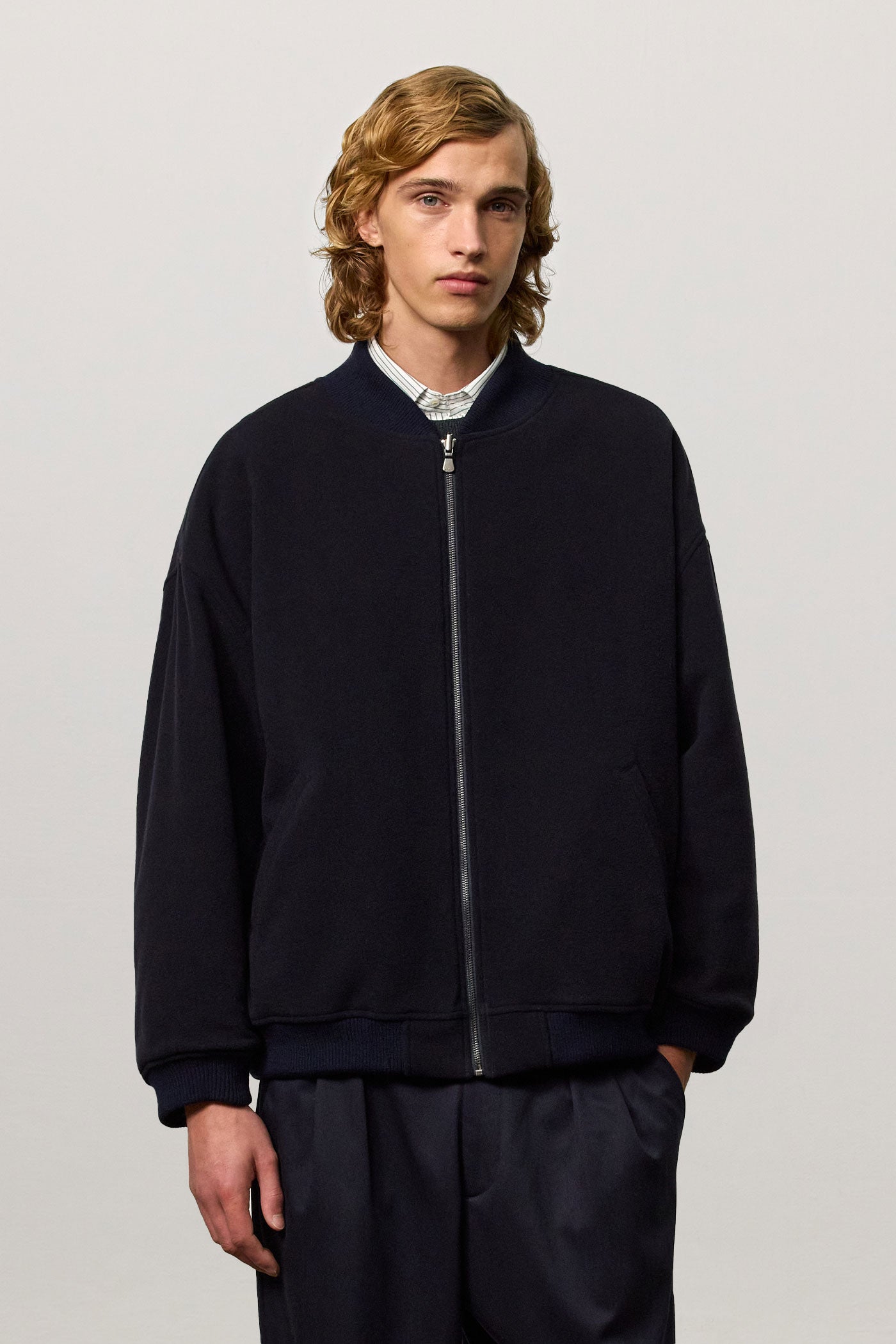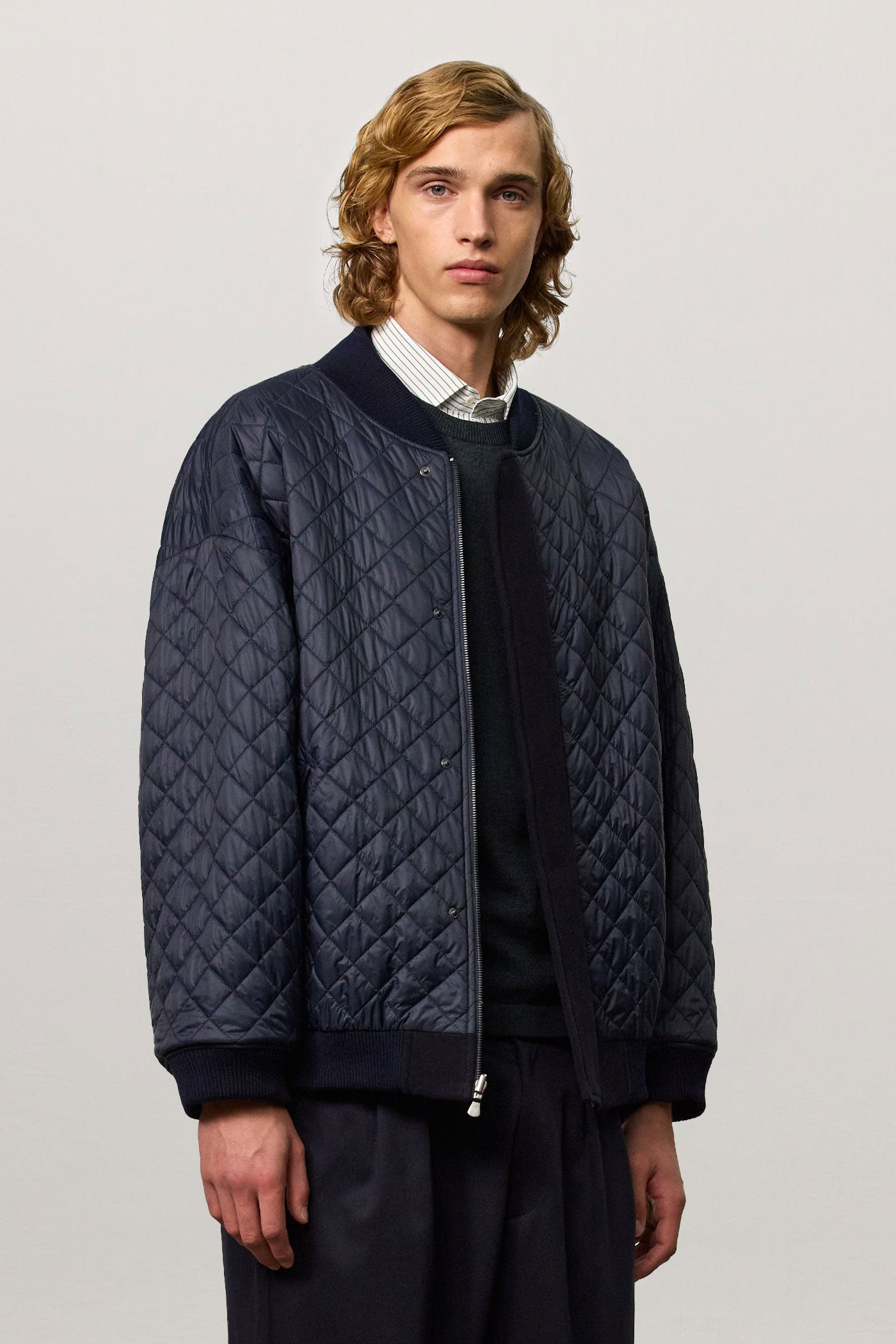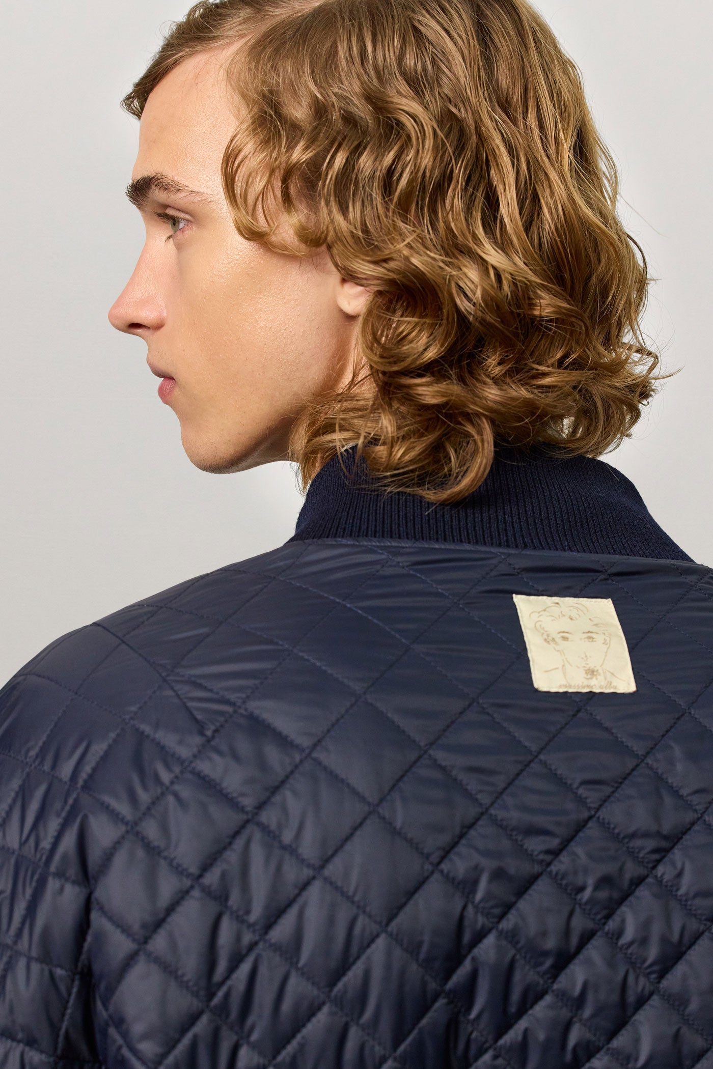 Reversible padded bomber jacket with a relaxed fit, featuring a front zip closure and raglan sleeves. It has two welt pockets on both sides. One side is crafted in compact virgin wool fabric, while the other side is quilted for extra warmth and style versatility. The jacket is finished with ribbed edges for a comfortable and snug fit. Made in Italy.