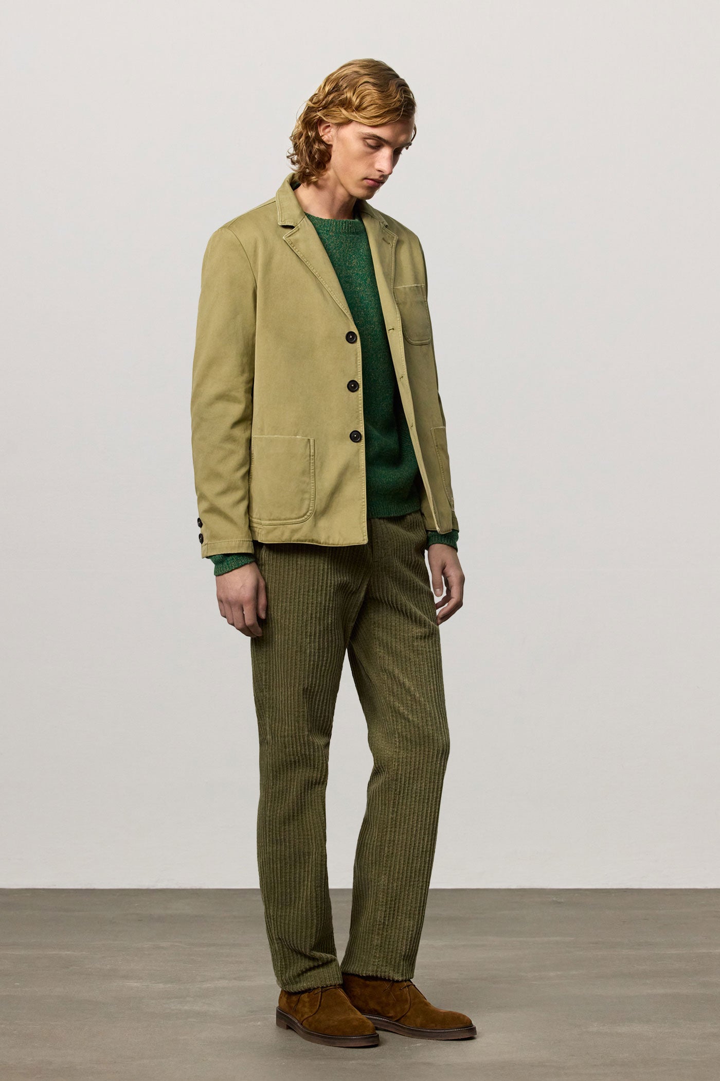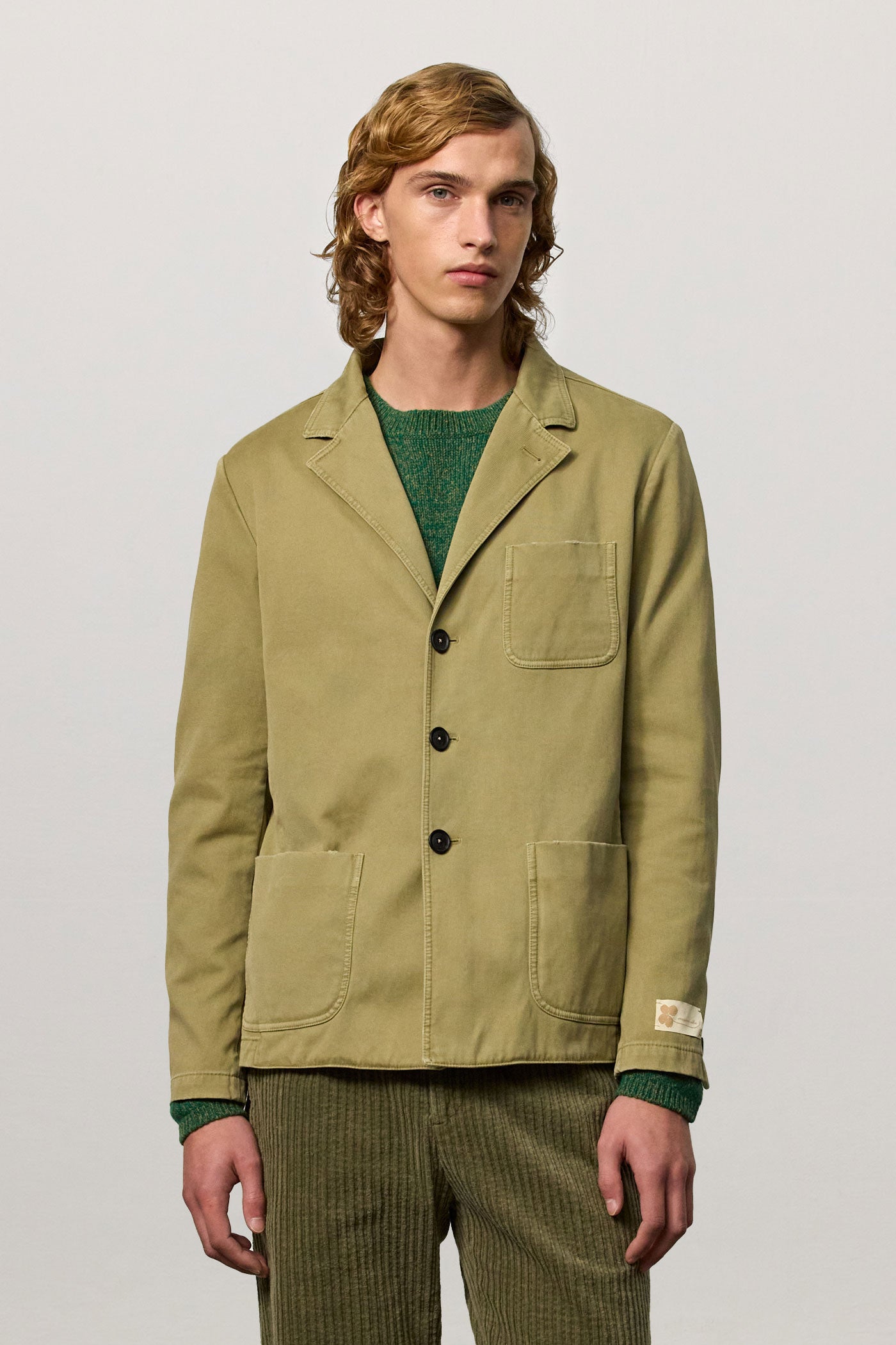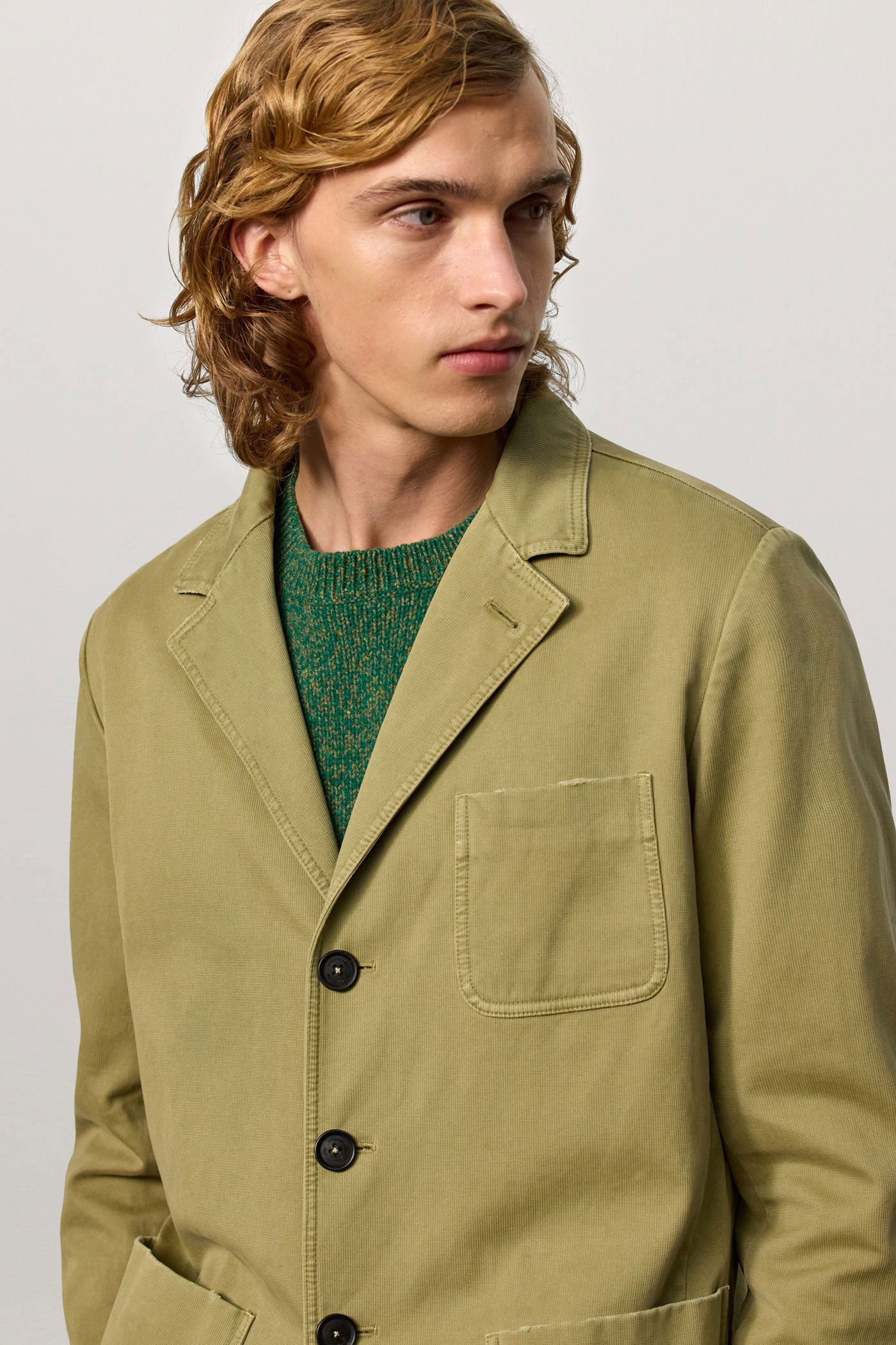 Informal jacket with four buttons, three patch pockets, and side vents, made of stretch cotton jacquard. Made in Italy.
