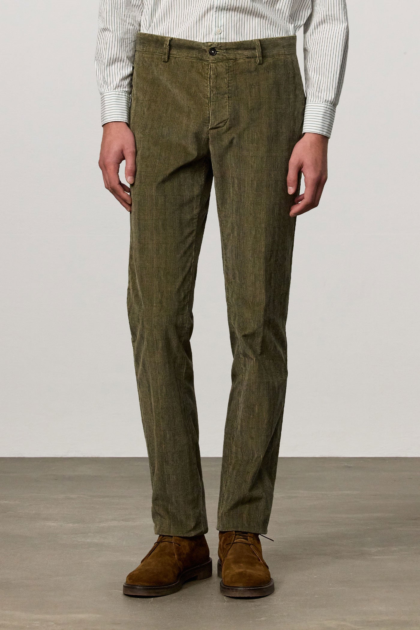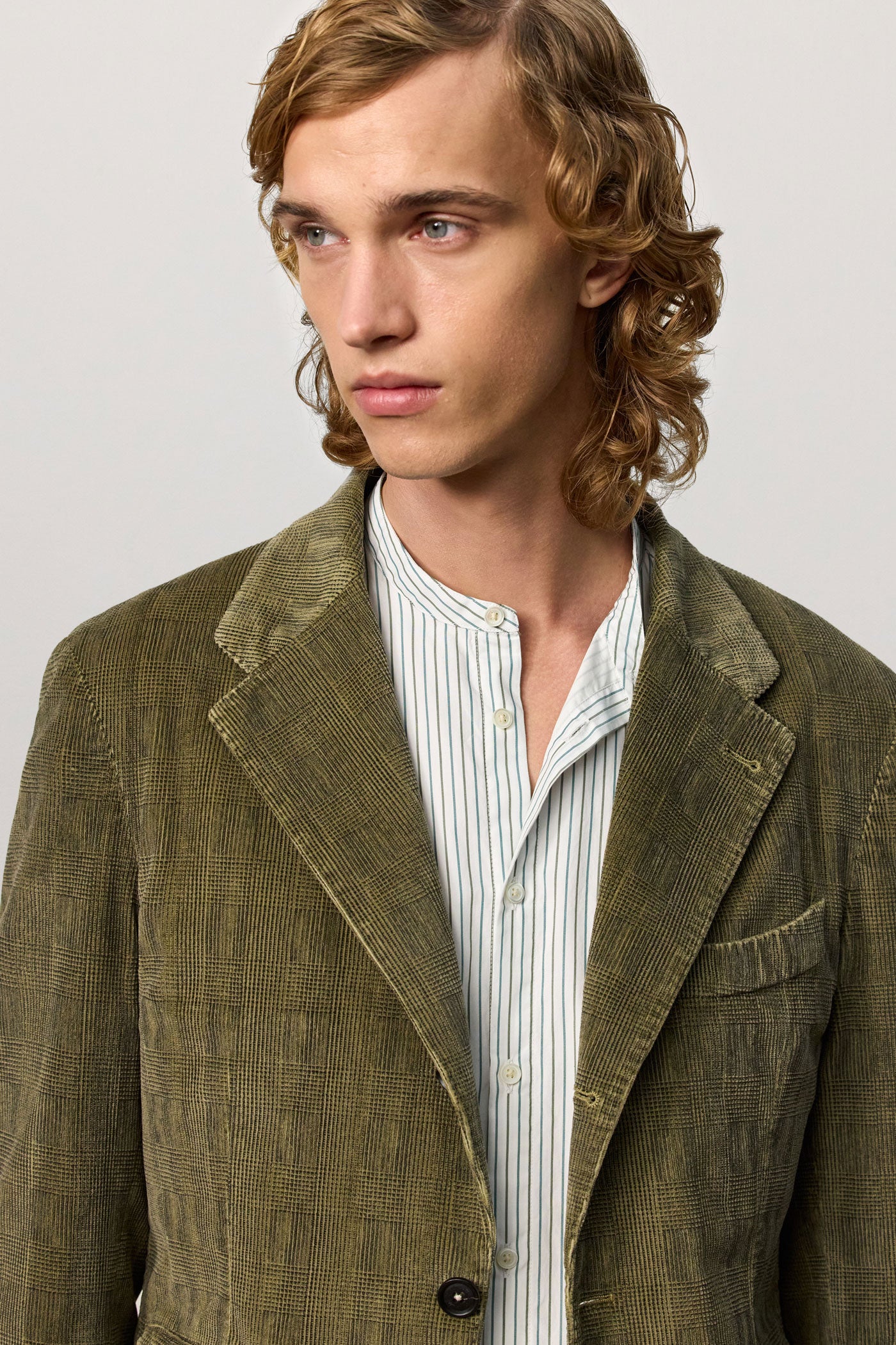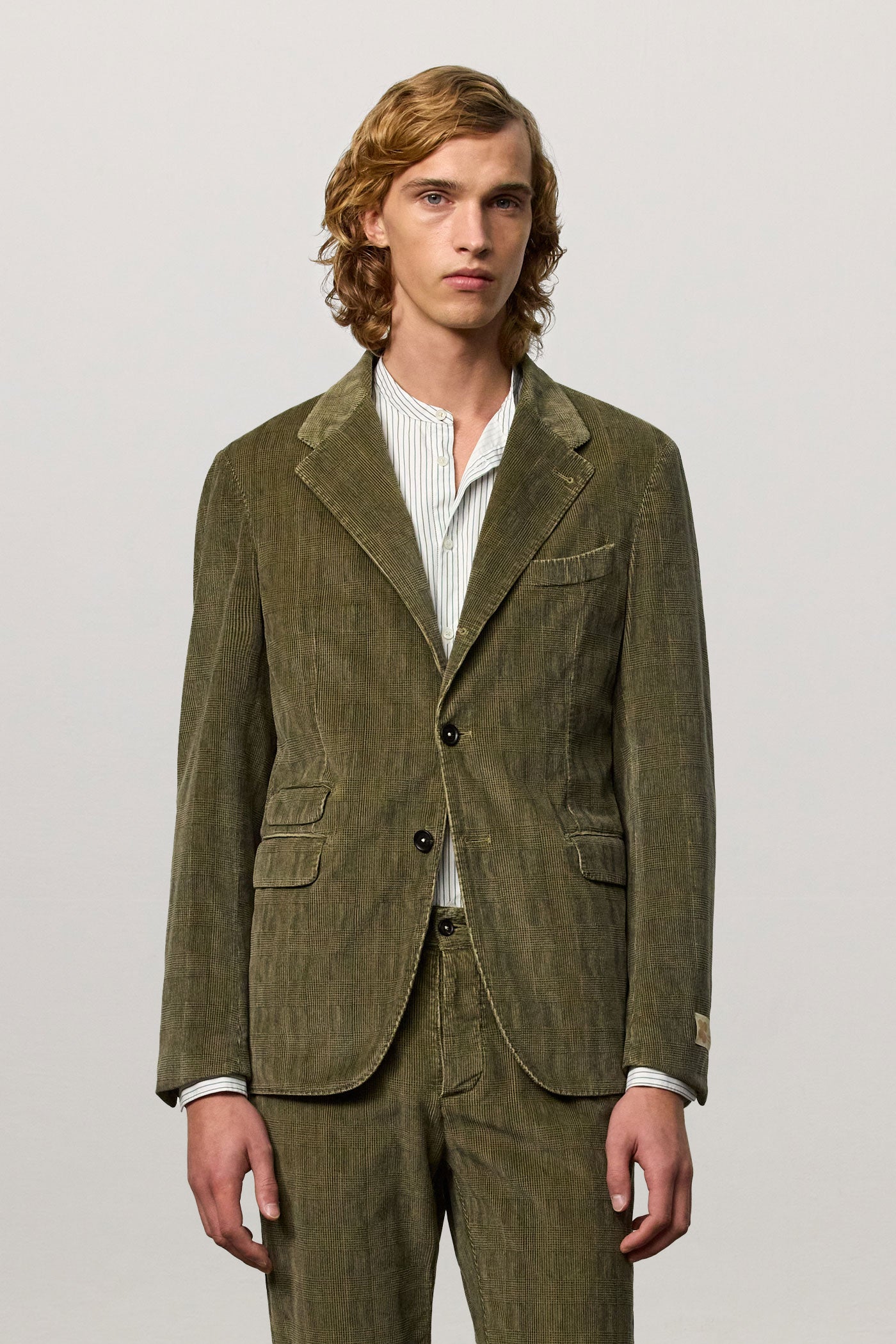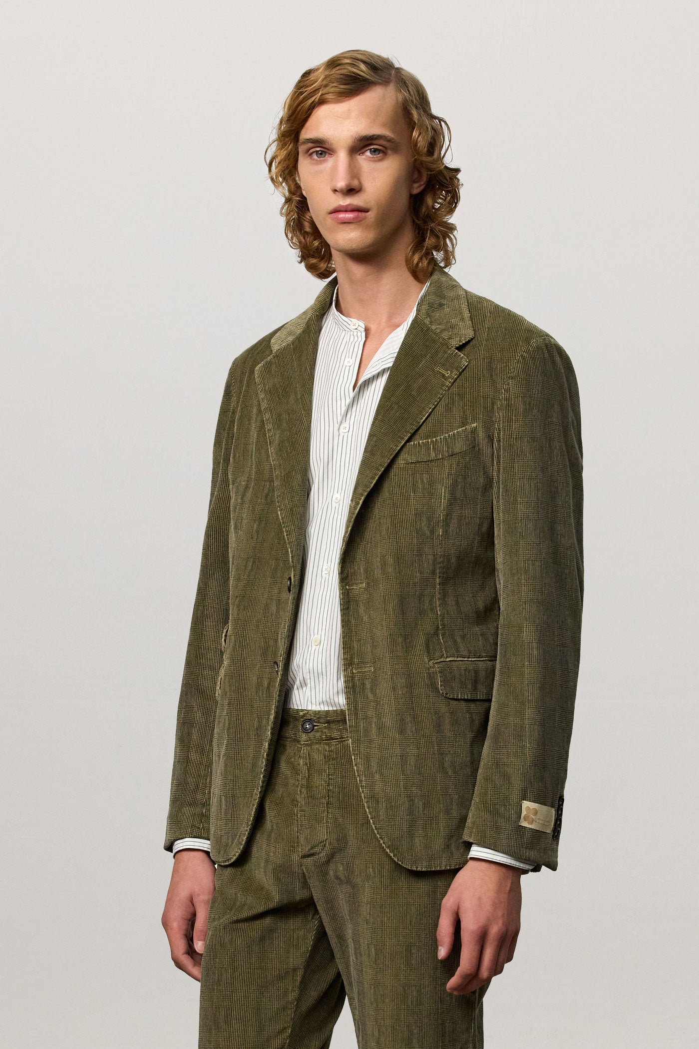 Casual deconstructed suit with three-button jacket, regular fit, classic notched lapel with stitching, flap pockets, dark horn buttons, two back vents, flat-front trousers, slim fit, straight leg, made in comfort Prince of Wales velvet. Made in Italy.