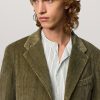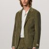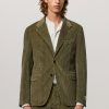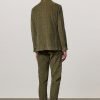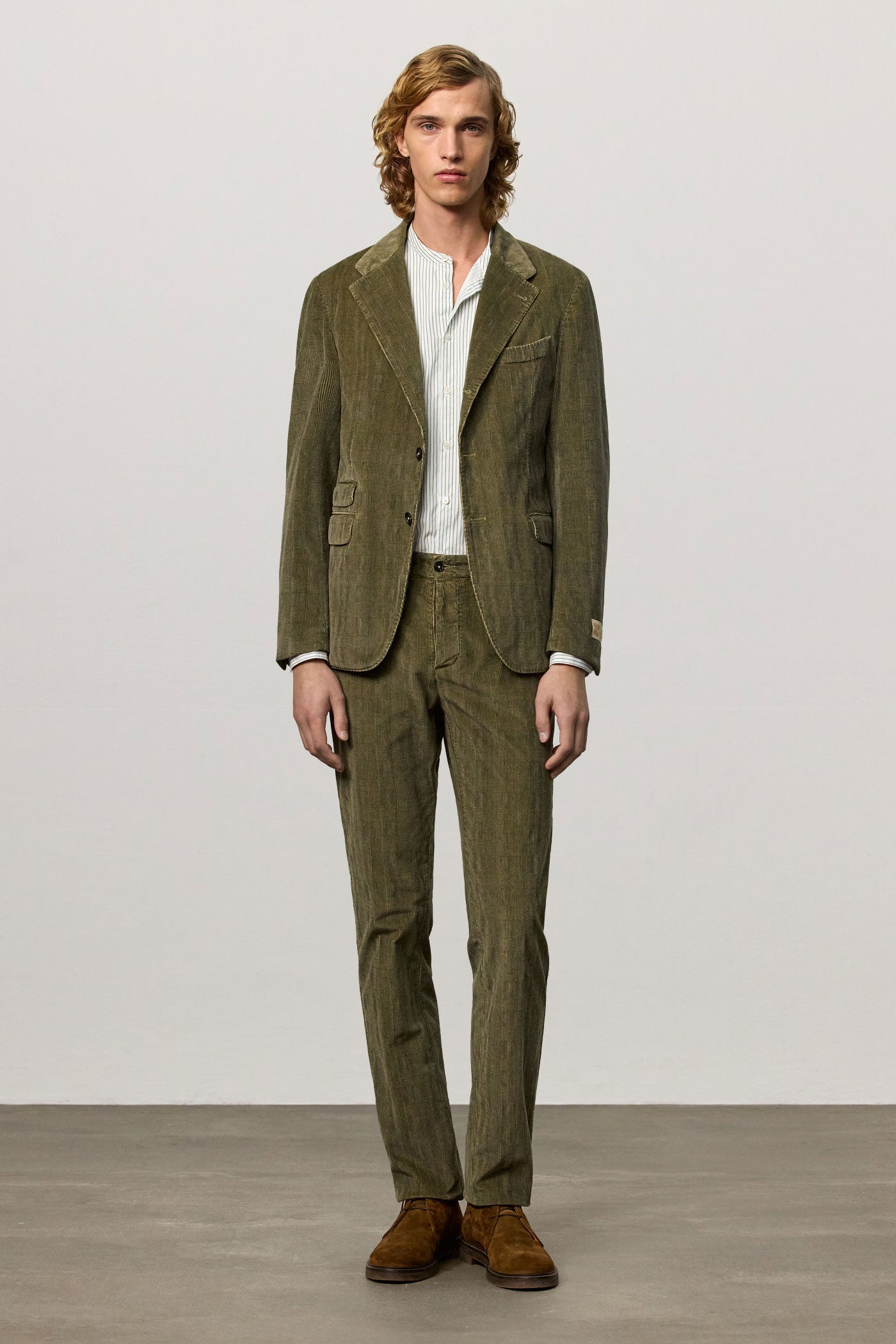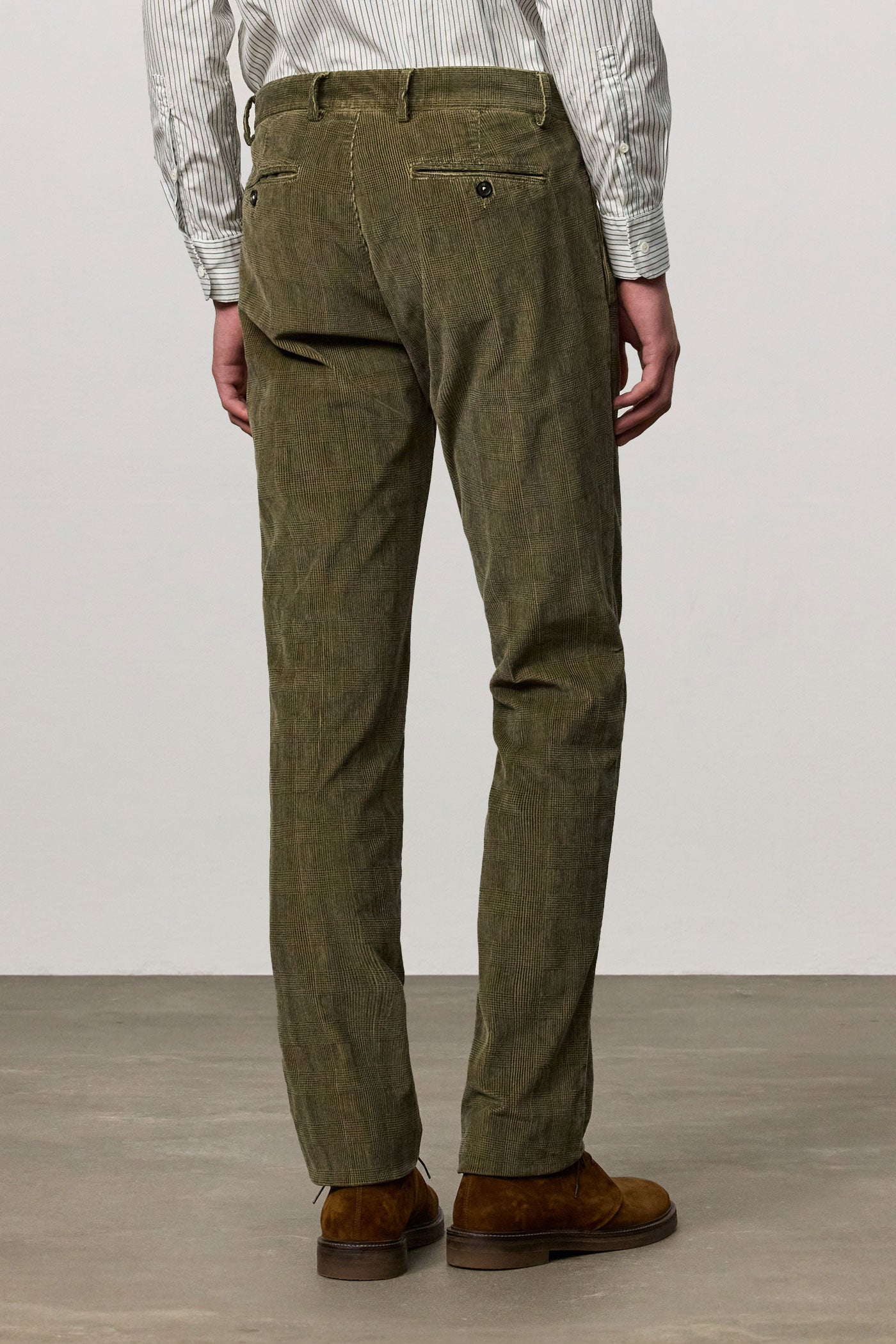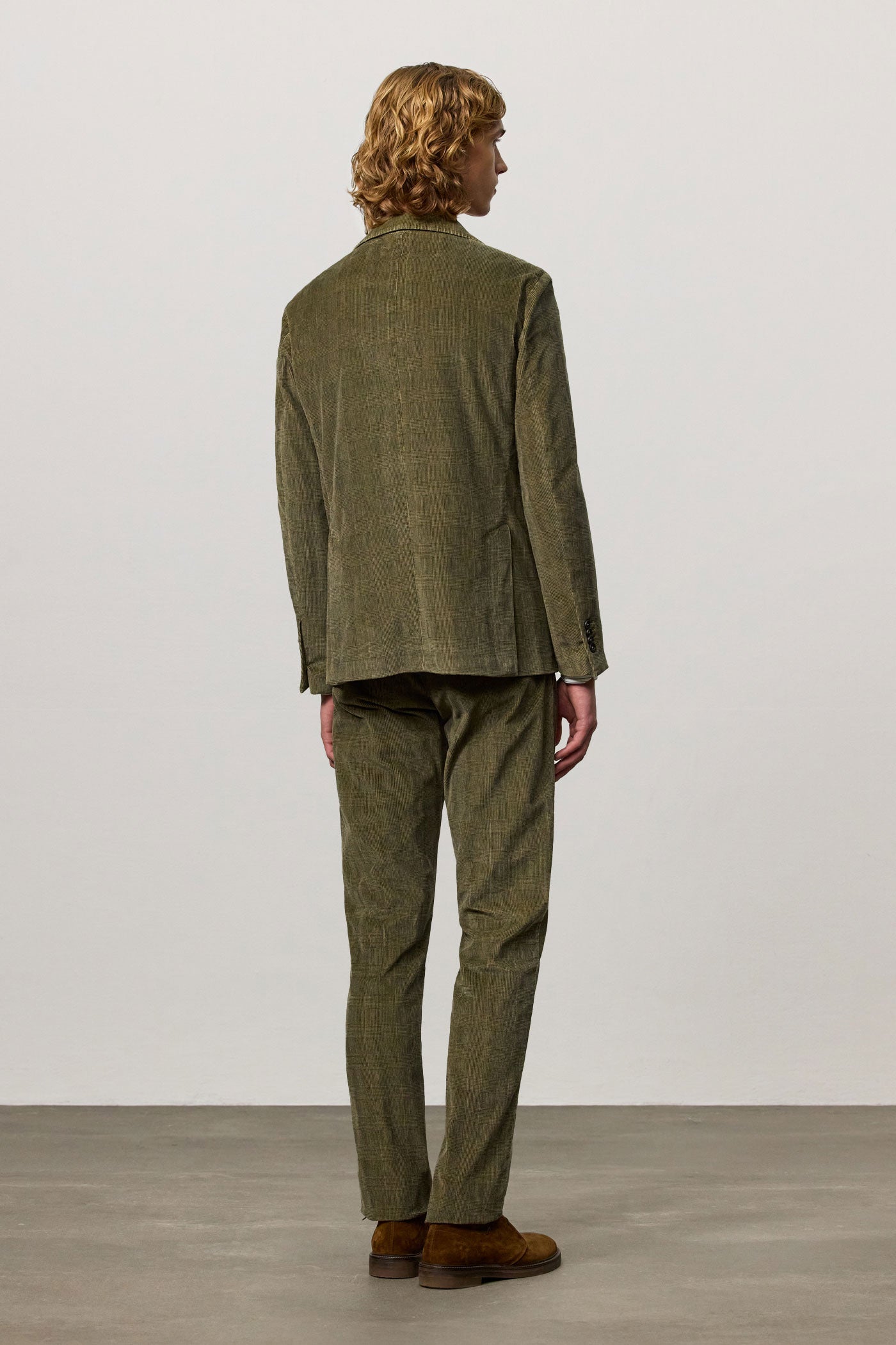 Casual deconstructed suit with three-button jacket, regular fit, classic notched lapel with stitching, flap pockets, dark horn buttons, two back vents, flat-front trousers, slim fit, straight leg, made in comfort Prince of Wales velvet. Made in Italy.