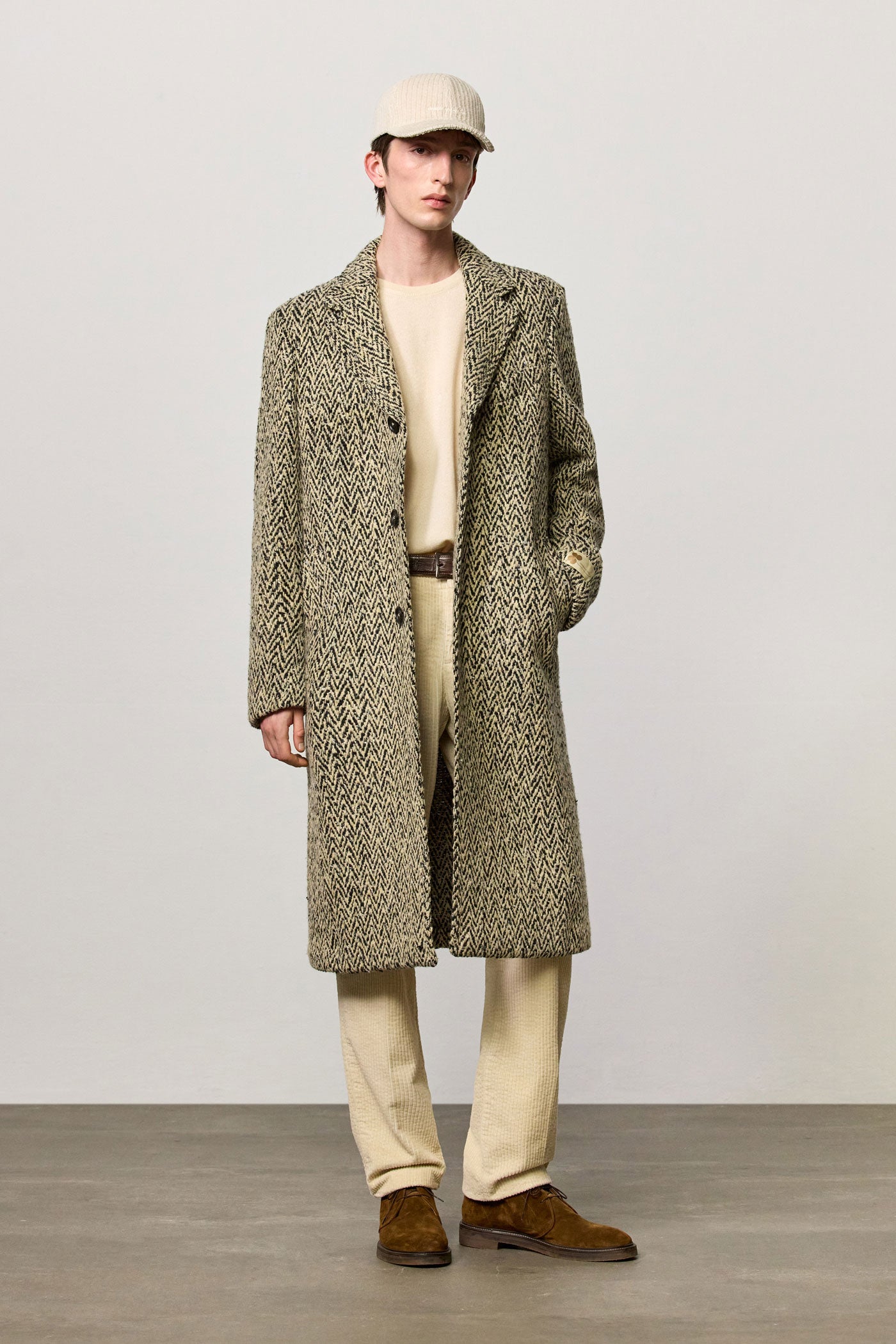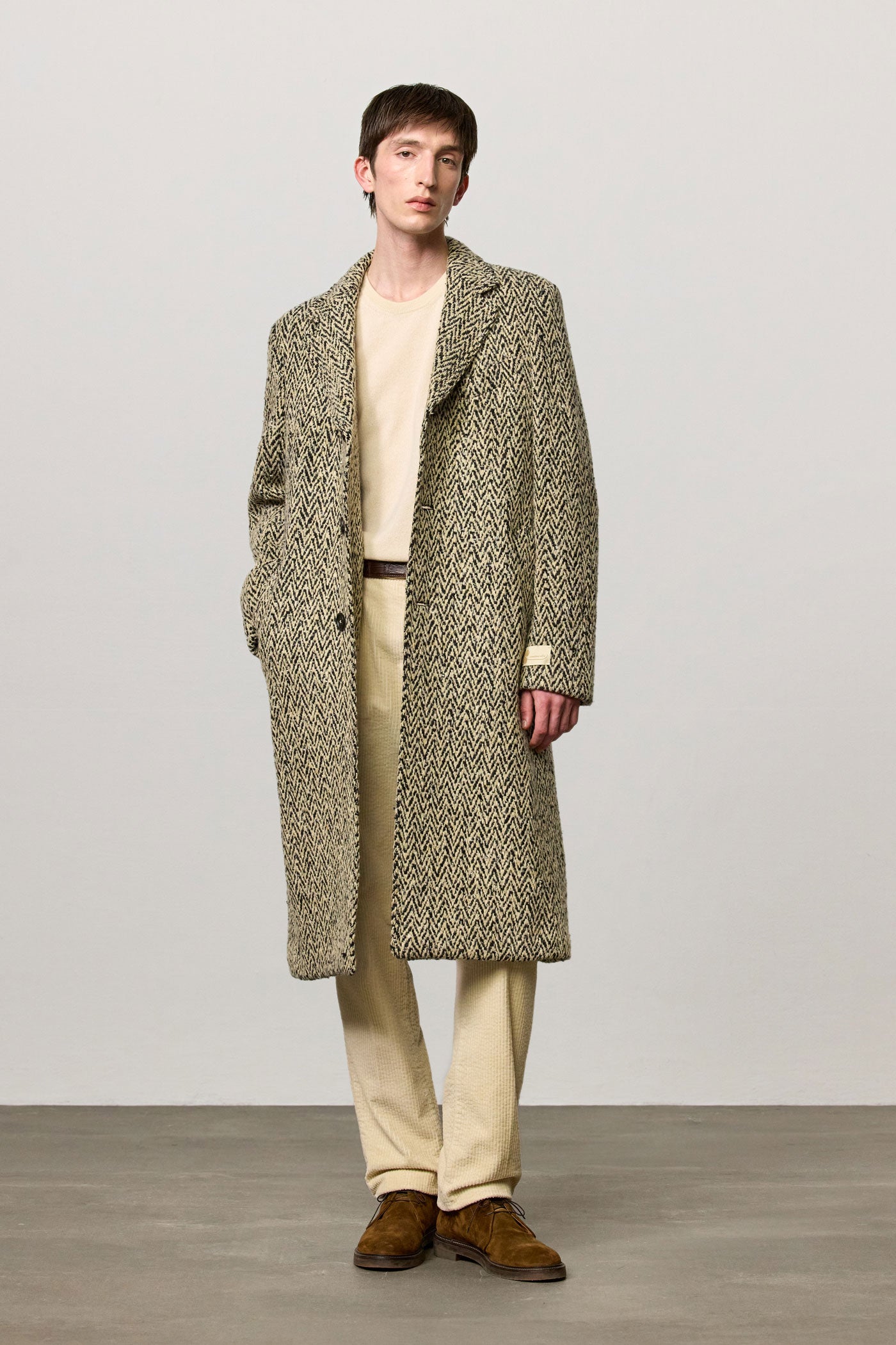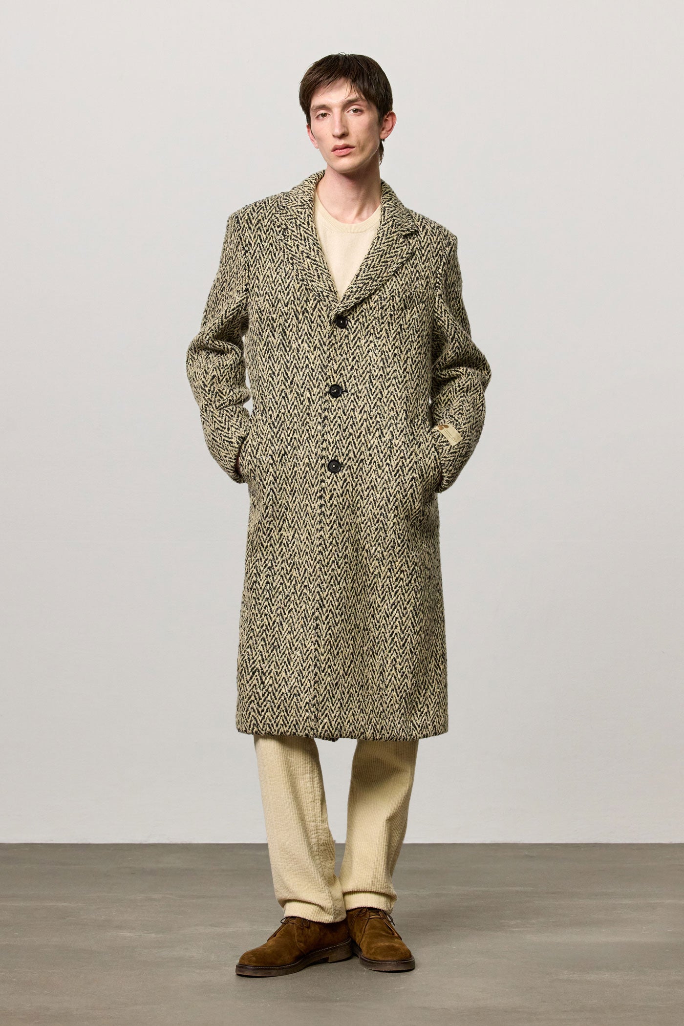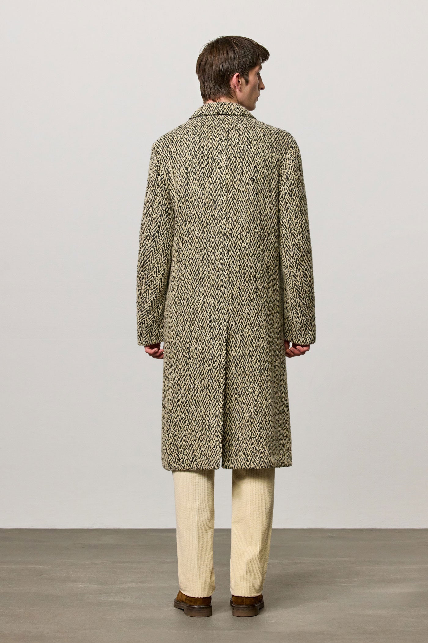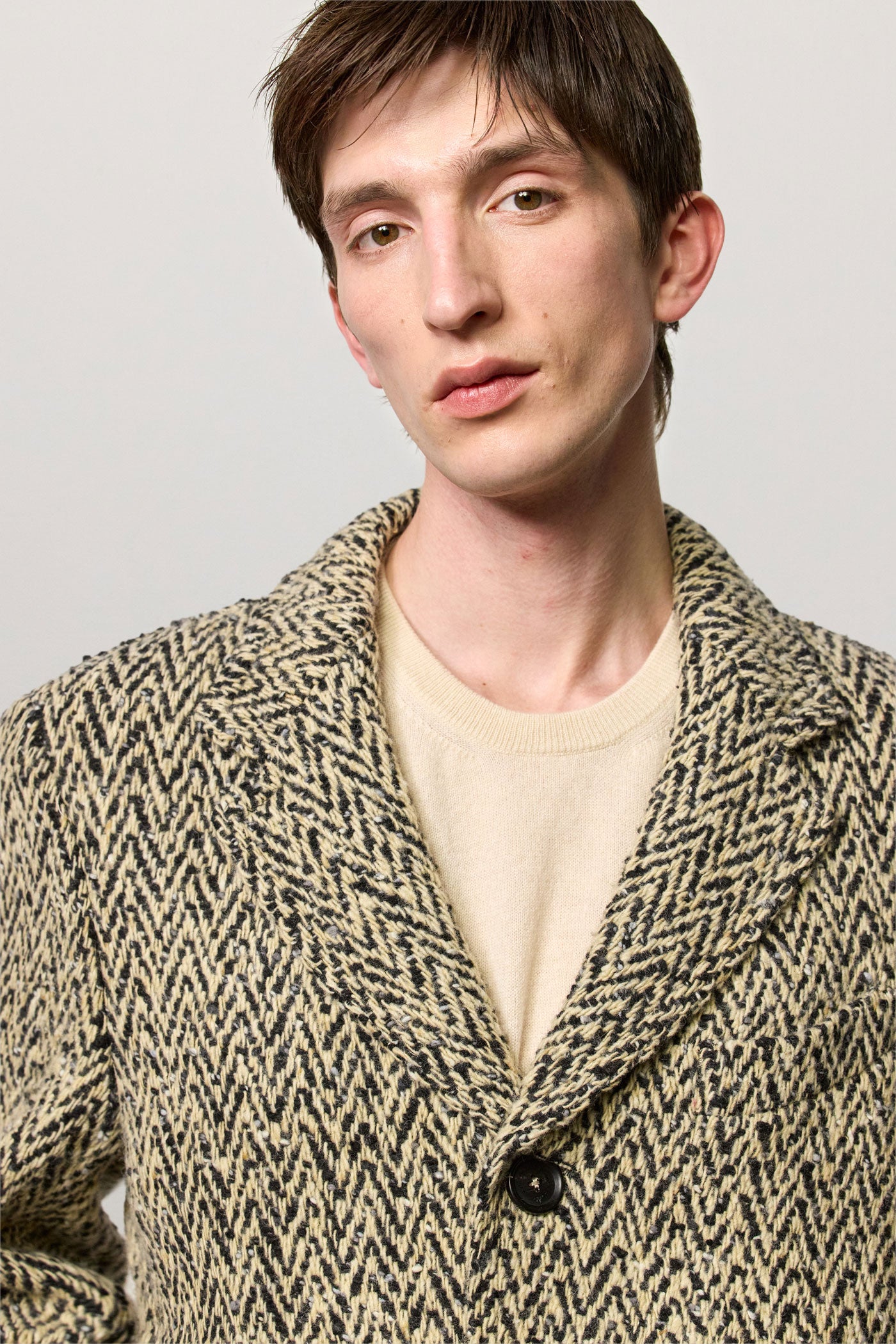Single-breasted coat crafted from virgin wool and cashmere herringbone, finished with horn buttons. Made in Italy.