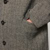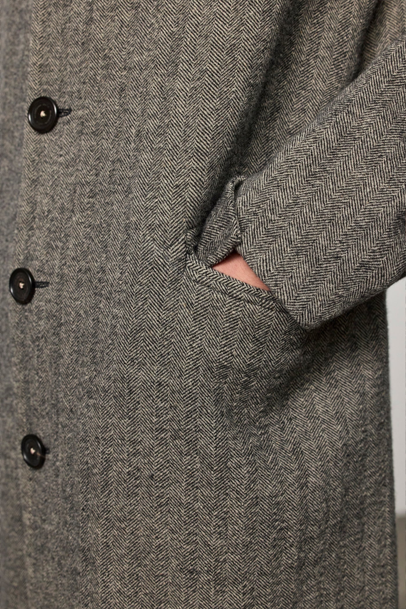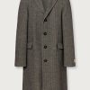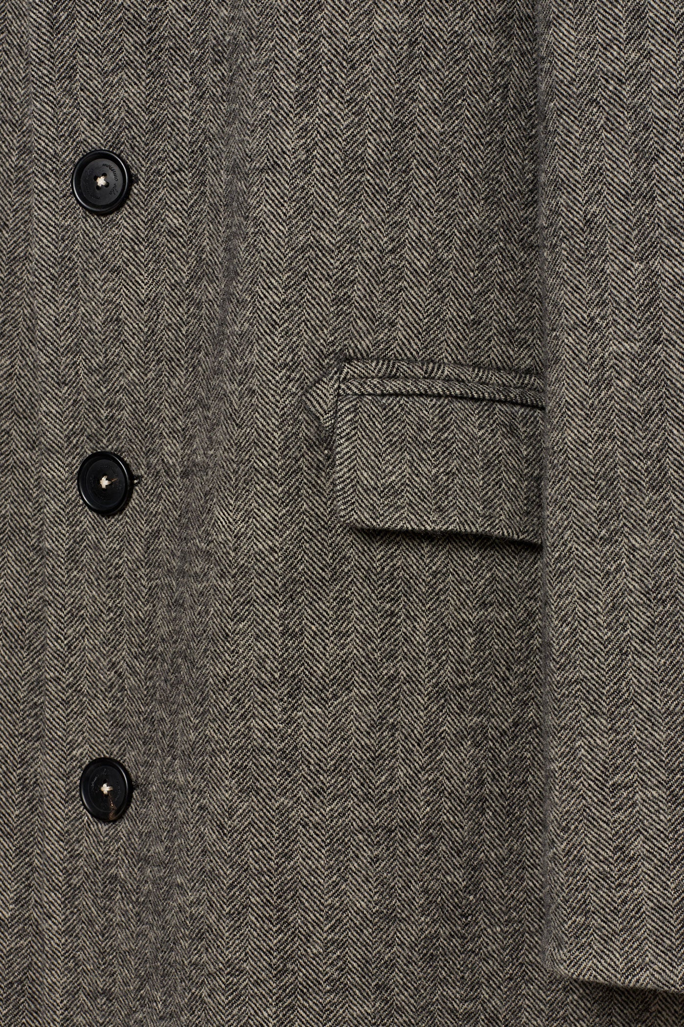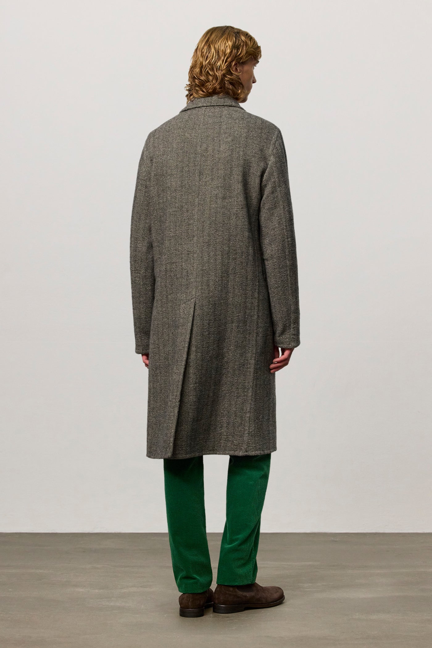 Classic fit single-breasted coat, four horn buttons, tall lapels, welt pockets with flaps, hand finished. Made in soft virgin wool double herringbone fabric. Made in Italy.