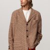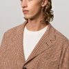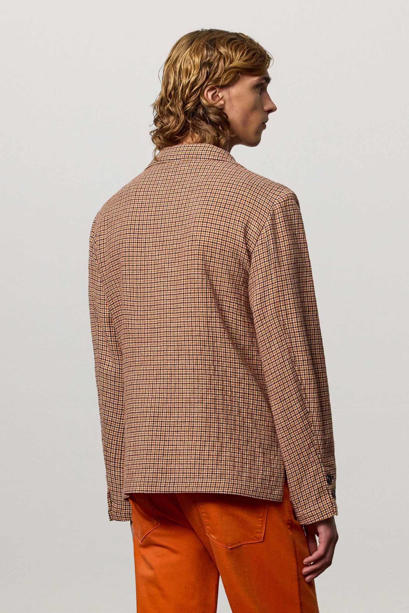 Informal jacket with four buttons, three patch pockets, and side vents, made of check-patterned seersucker in a comfort stretch wool blend. Made in Italy.