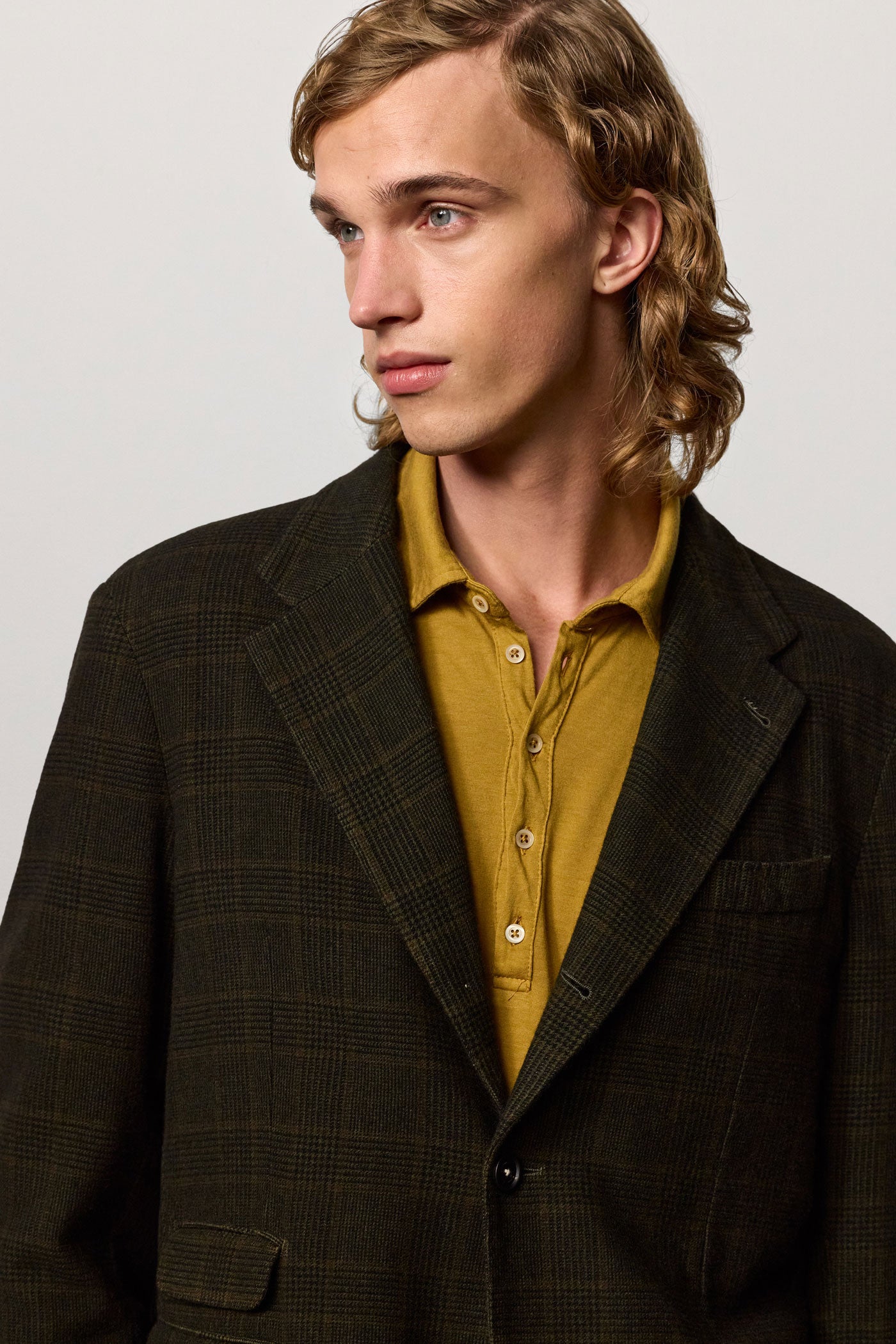 Regular-fit jacket inspired by classic tailoring. Single-breasted with notch lapels, flap pockets with a ticket pocket, and double back vents. Finished with horn buttons. Made from Prince of Wales pattern in pure virgin wool. Made in Italy.
