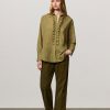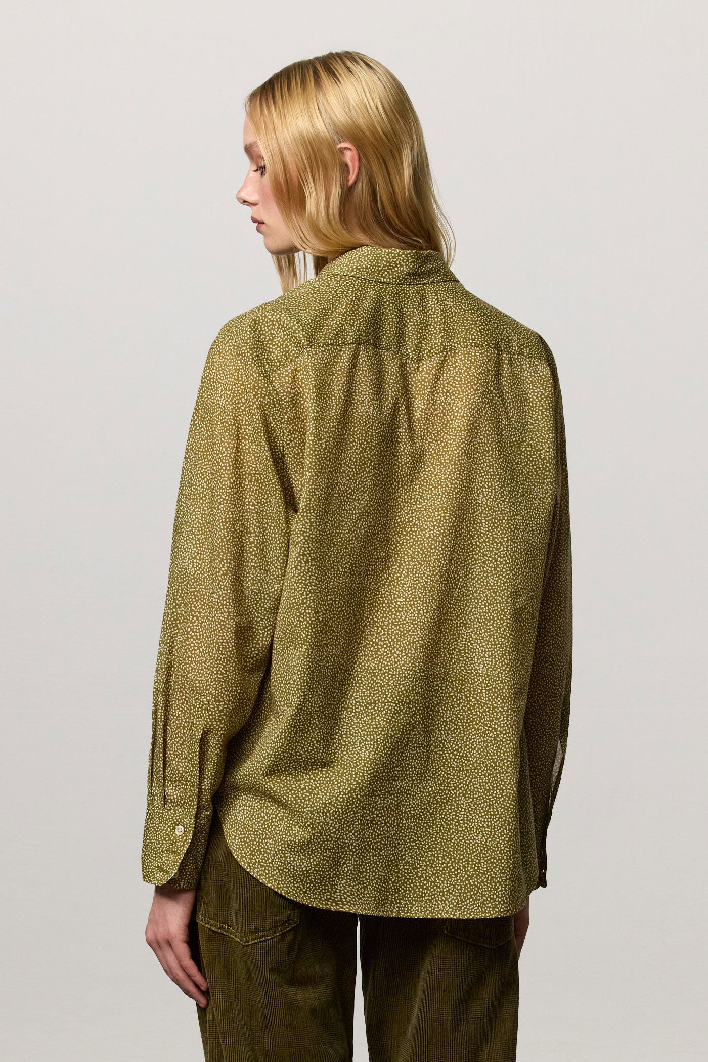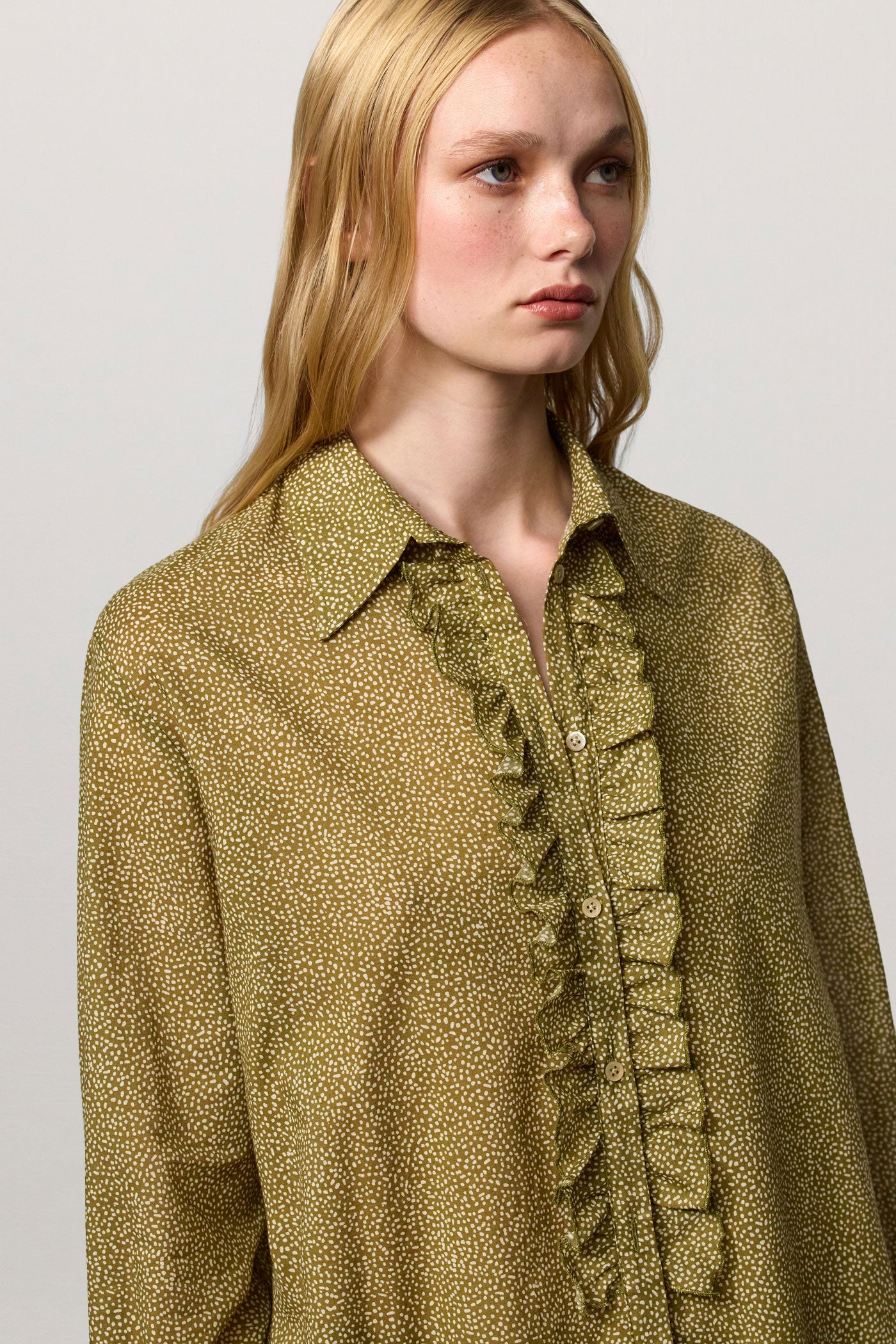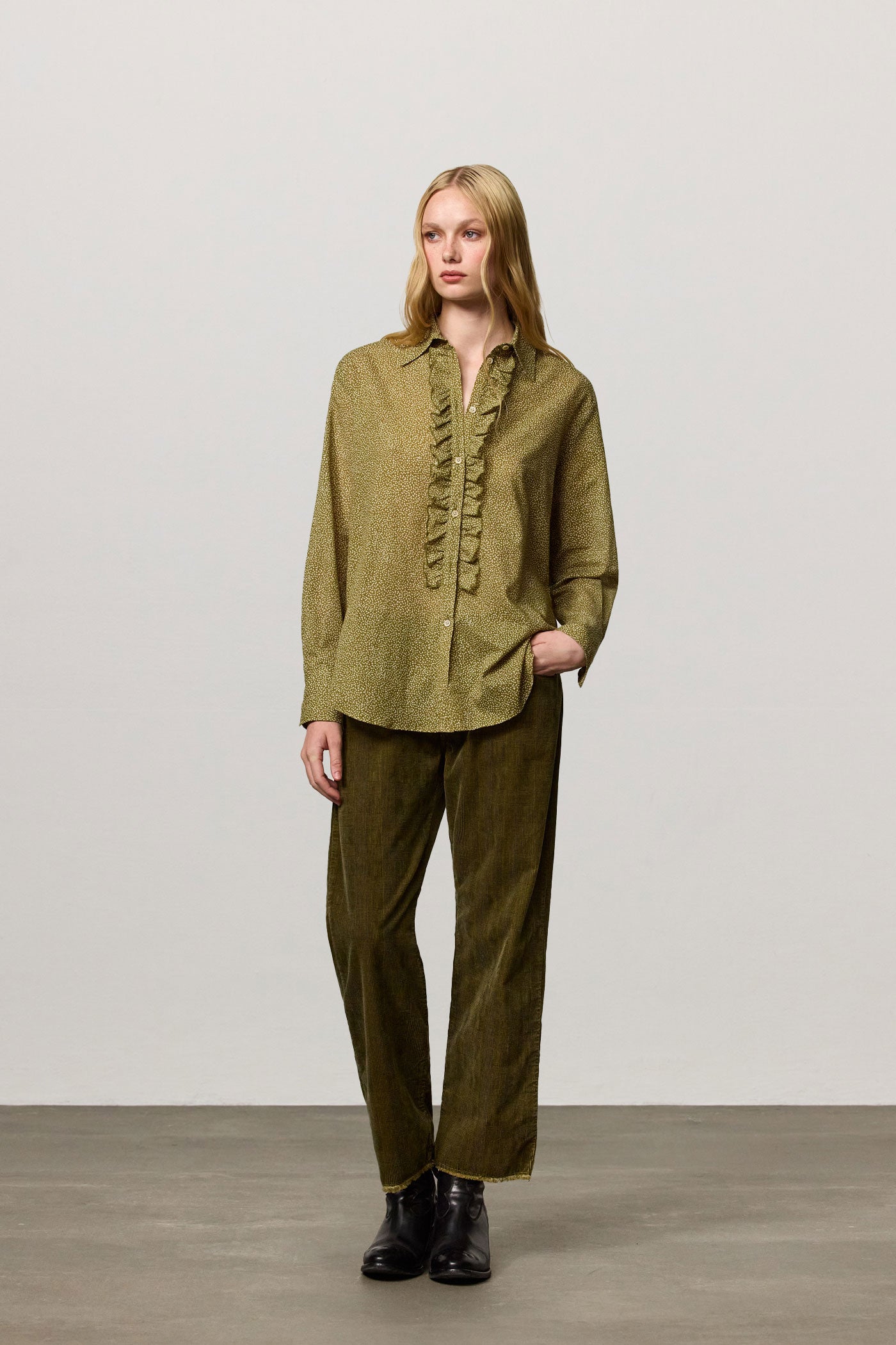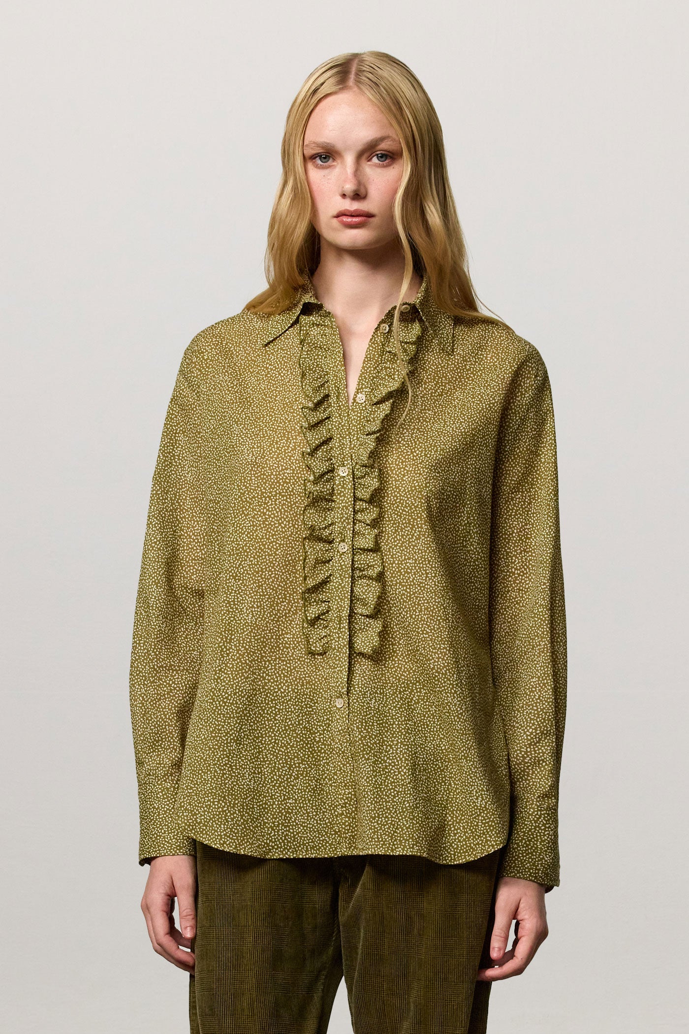 Comfort shirt with front ruffle and pointed rear yoke. Made of exclusive print cotton cashmere. Made in Italy.