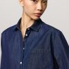Shirt with classic collar, chest pocket, rounded collar stand and small embroidered crest on the front for adding initials. Crafted from light indigo cotton denim. Made in Italy.