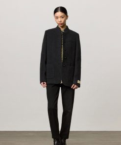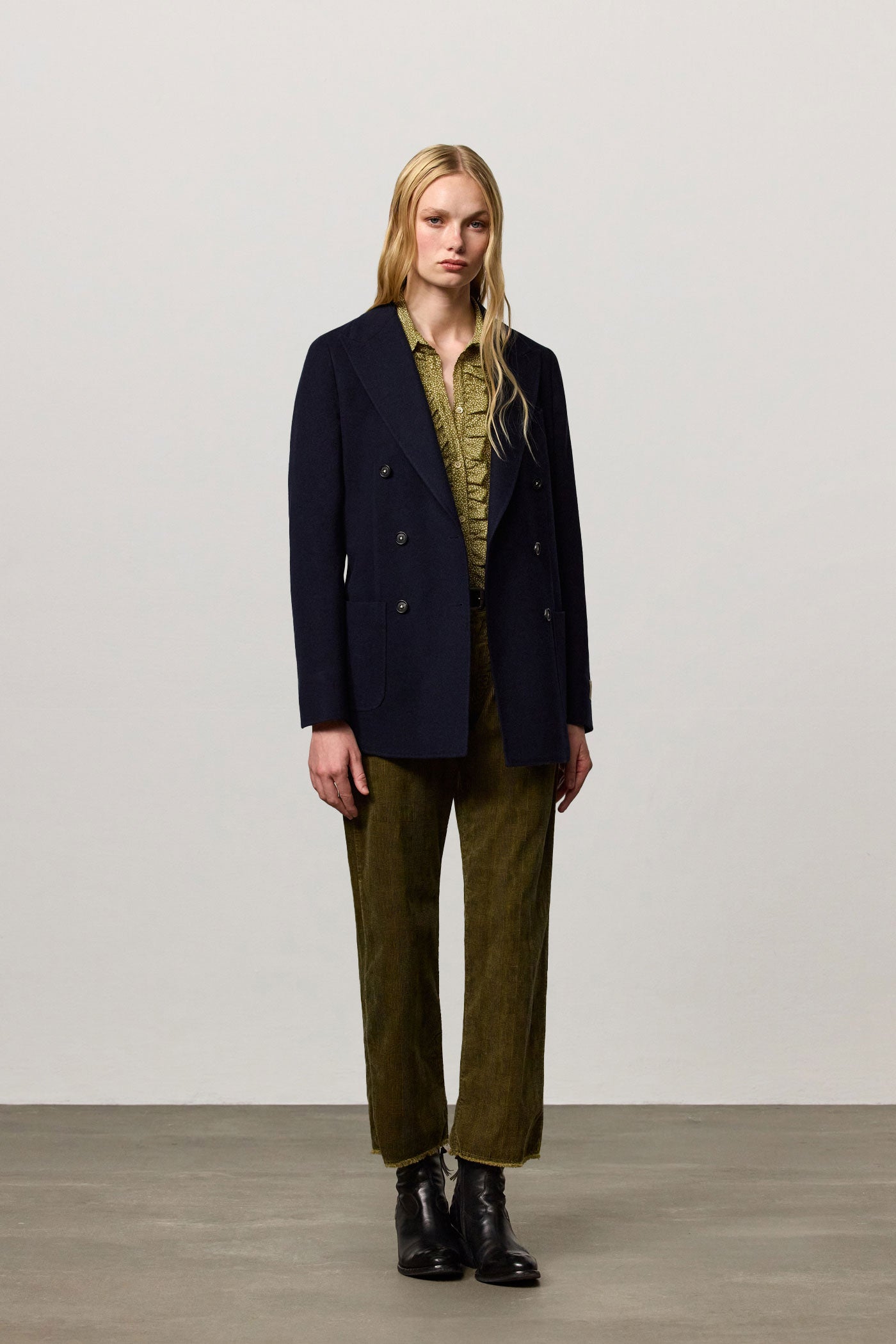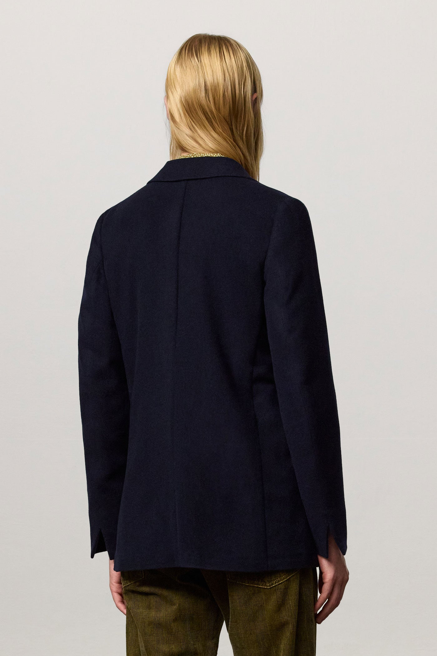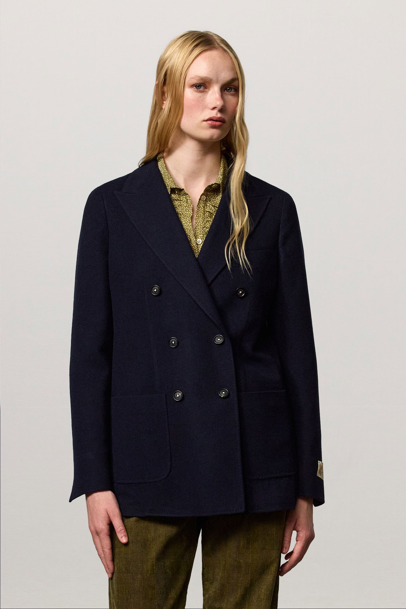 Long double-breasted jacket, deconstructed and unlined, characterized by patch pockets and spear lapels, six buttons in real horn, made in a wool silk cashmere blend. Made in Italy.