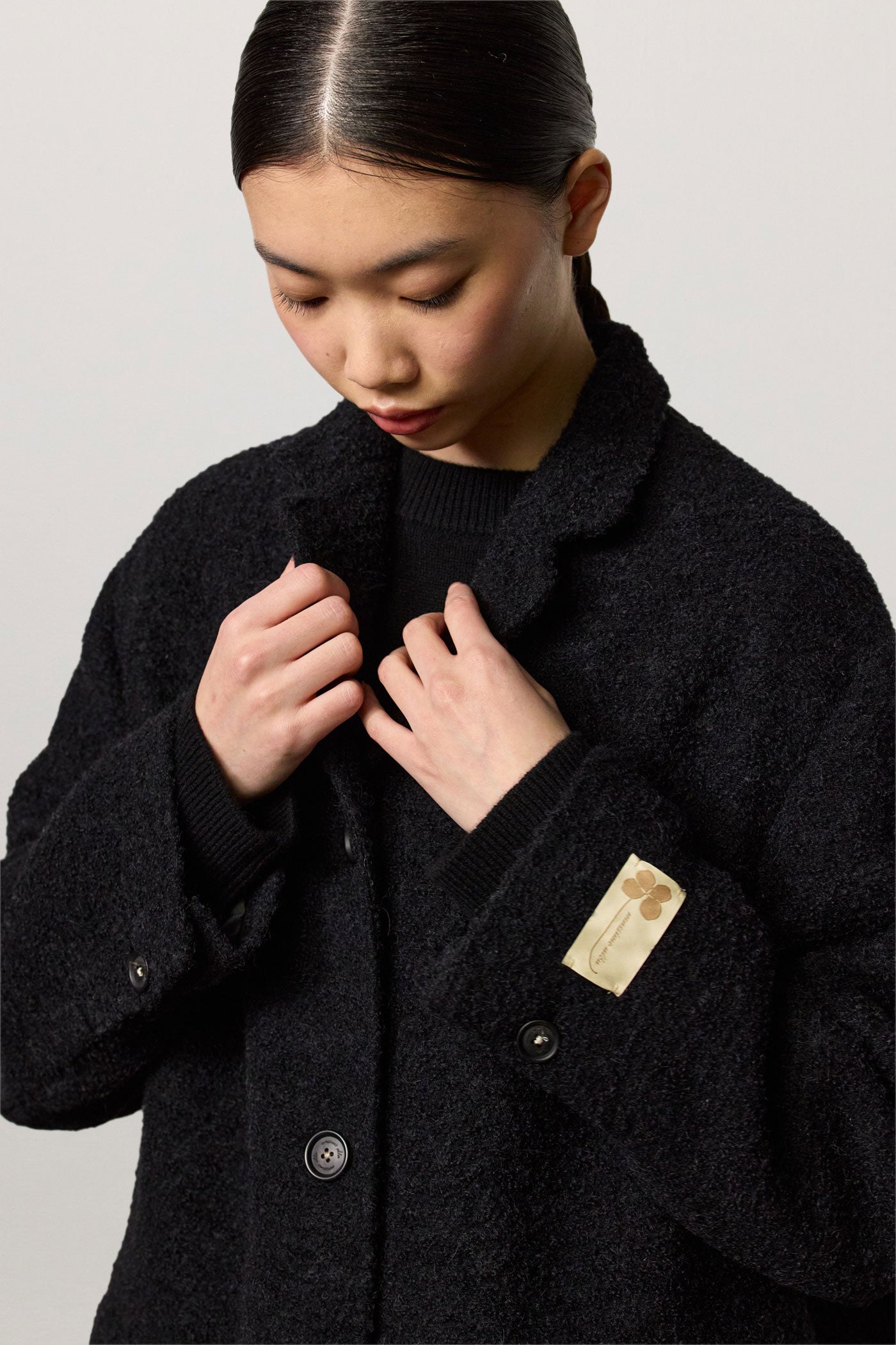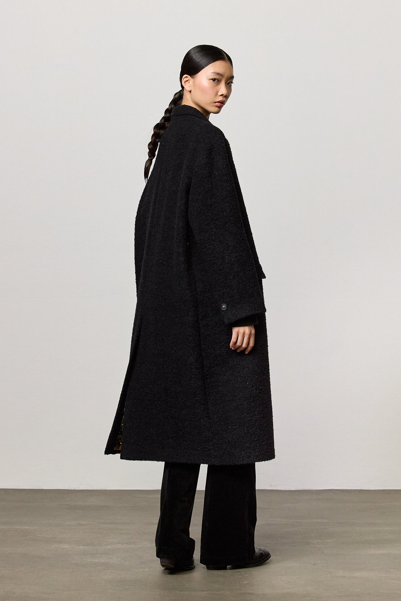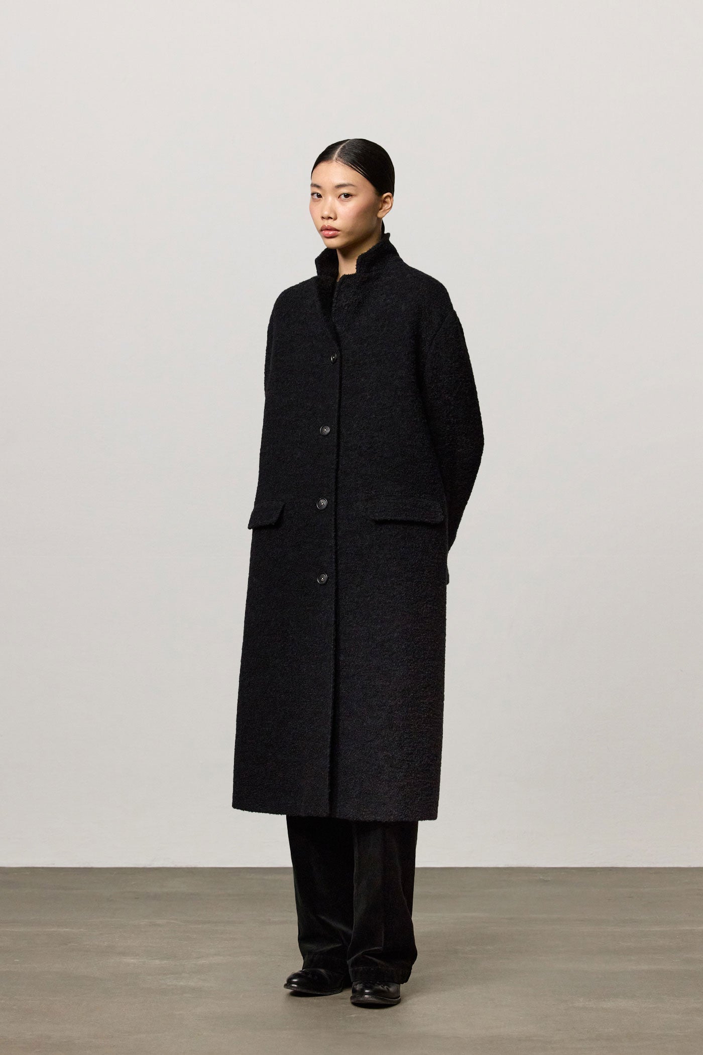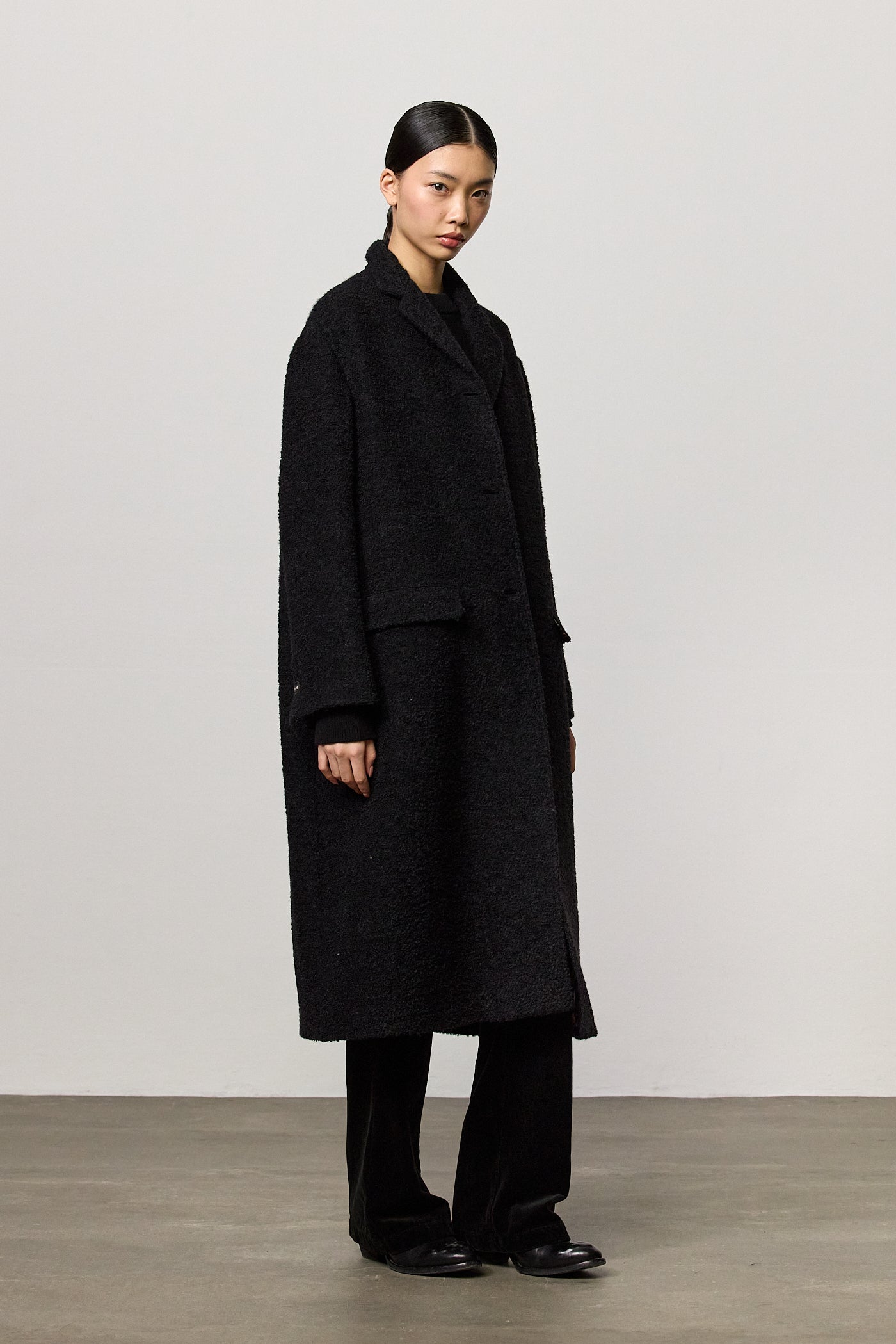 Single-breasted overcoat with dropped shoulders, welt pockets with flaps and four genuine horn buttons. Crafted from virgin wool and nylon bouclé. Made in Italy.